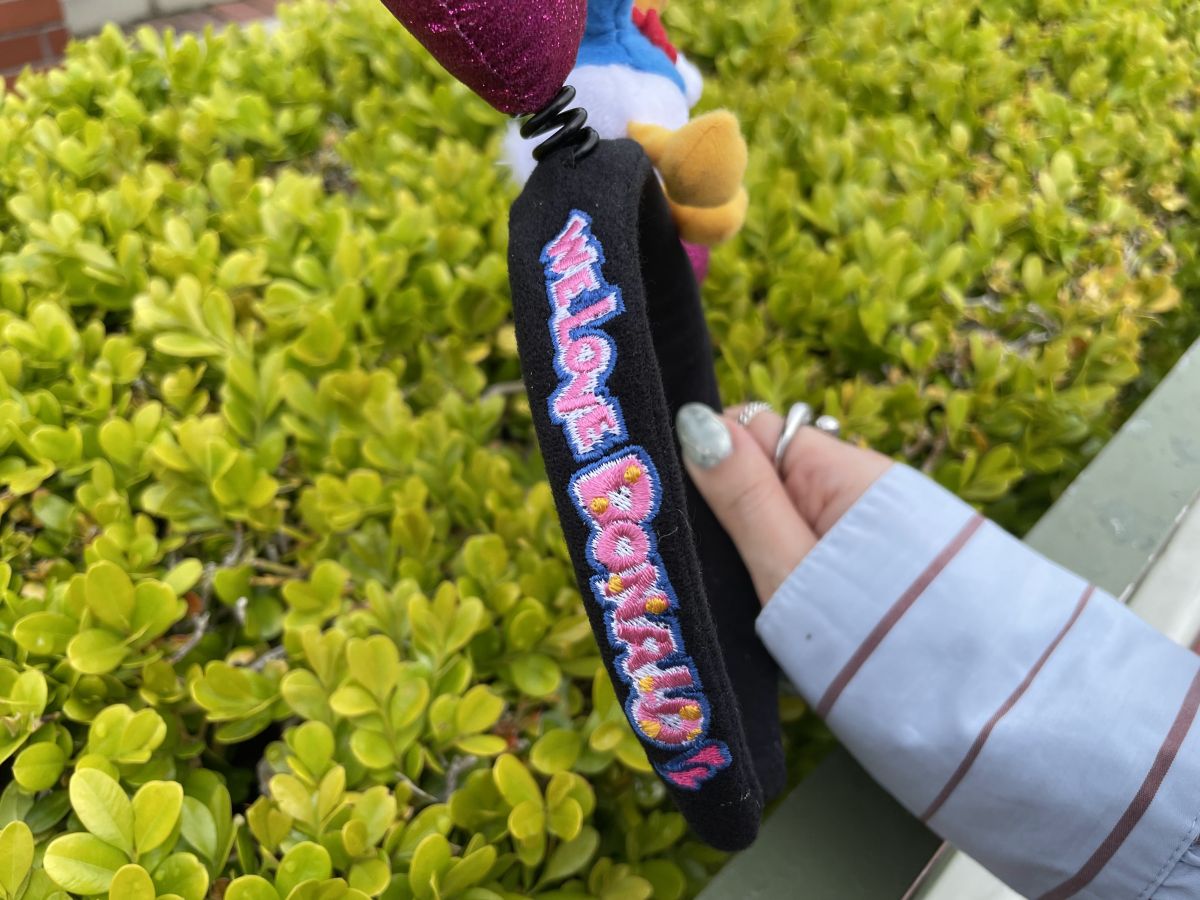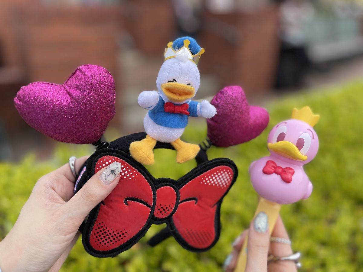 パレード開催時に身に着けていたらドナルドが喜んでくれそうなアイテムが登場。振ると“グワッ、グワッ”と鳴く「グワグワスティック」1500円や、“WE LOVE DONALD”の刺繍が入った「カチューシャ」2400円、ドナルド蝶ネクタイをイメージした型の「パッチン」1200円などが、ワールドバザール「ディズニー&カンパニー」で販売中。