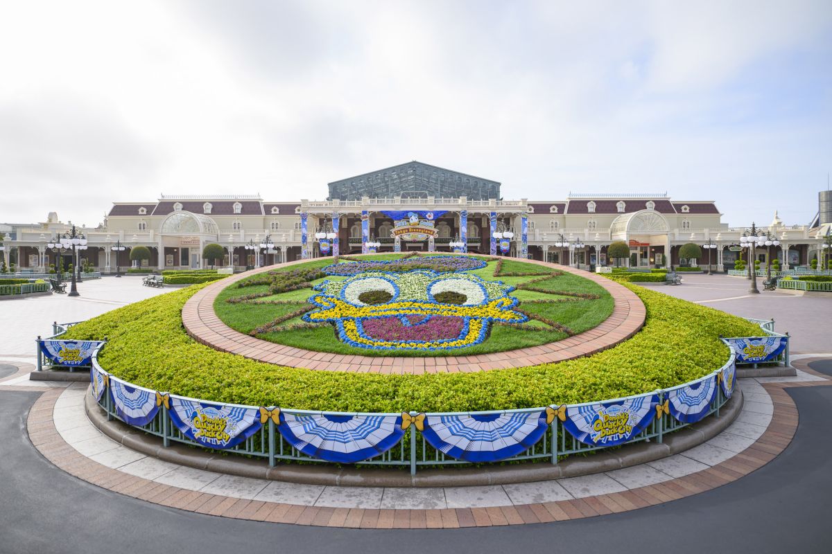 エントランスでは、ミッキー花壇がドナルド花壇になっているほか、周辺の花壇もドナルドをイメージさせるデザインに。