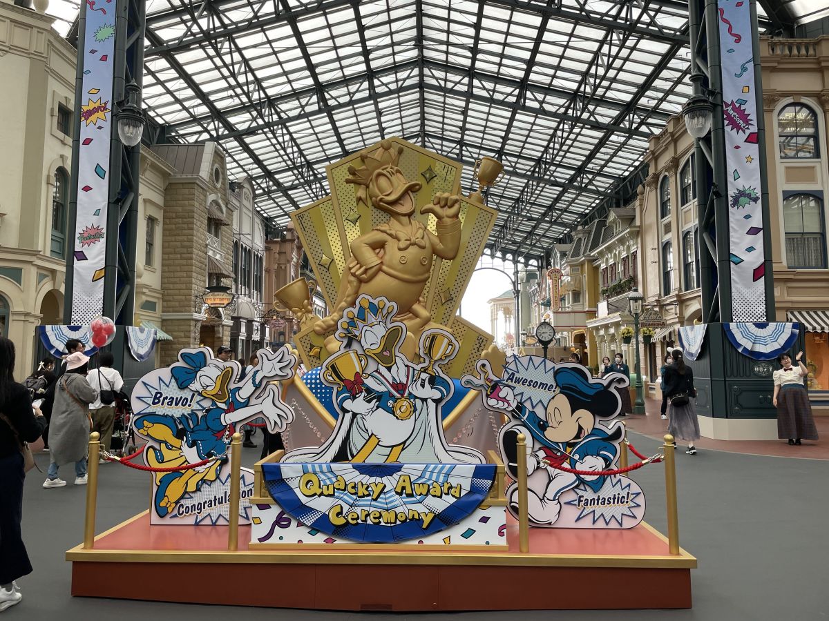 ワールドバザール入口に掲げられた看板、バナーなども「ドナルドのクワッキー・ダックシティ」バージョンになっています。