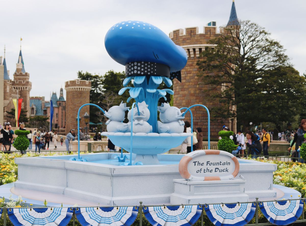 中央の花壇には表情豊かなアヒル噴水のオブジェのほか、ドナルドをイメージした植栽も。