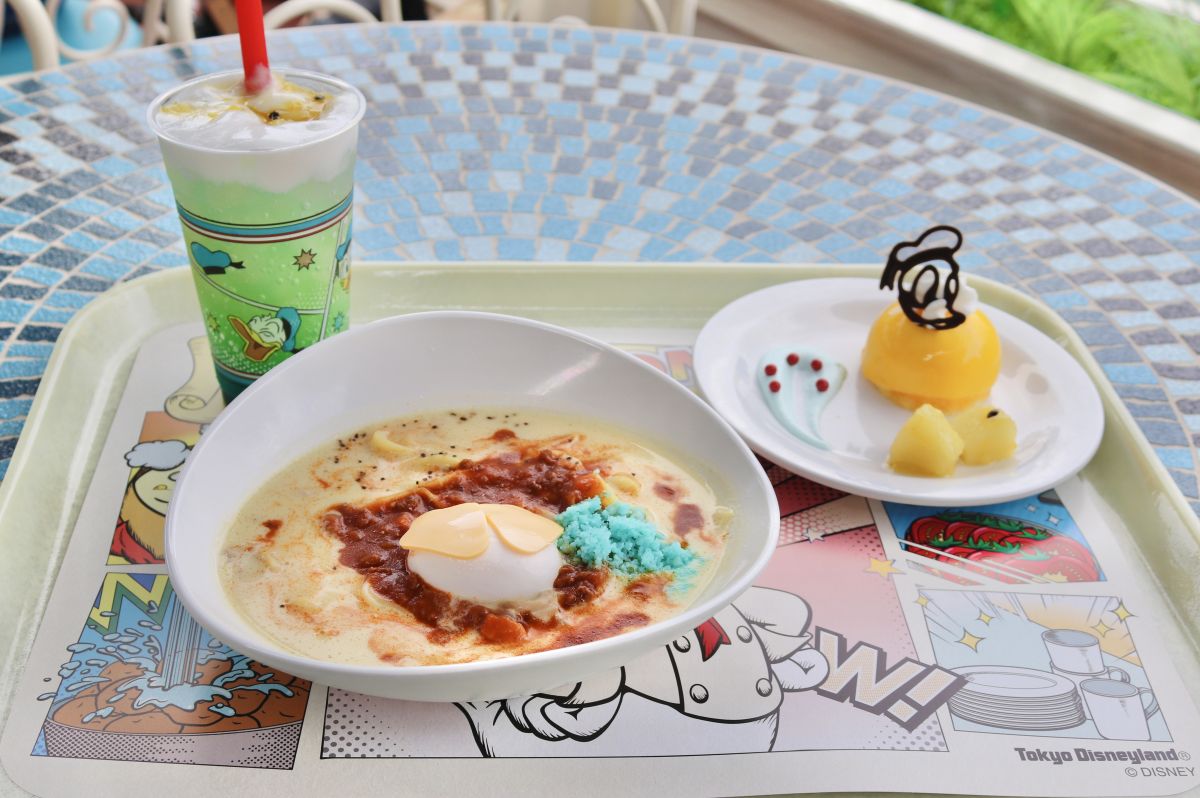 店舗もかわいいデコレーションになっている「プラザパビリオン・レストラン」では「ダックダイブ・パスタセット」2040円(ソフトドリンクをプラス620円で「スパークリングゼリードリンク(トロピカルフルーツ&オレンジ)」に変更)が食べられます。