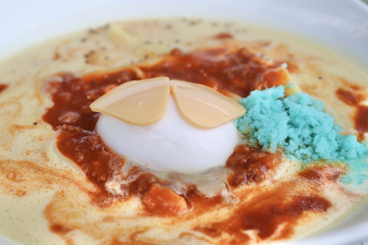 ドナルドがパスタに飛び込んだような半熟卵のトッピングを割って、ソースに絡めればおいしさアップ。ちなみに青いトッピングはパルメザンチーズをちょっと甘いブルーのシロップで色付けしたものなのだそう。シェフのこだわりを感じる一品です。