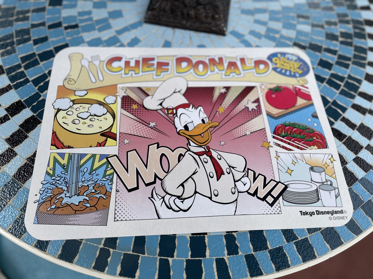 このメニューは得意気な表情がたまらないシェフ姿のドナルドが描かれたランチョンマット付き。もちろん持ち帰りOKです。
