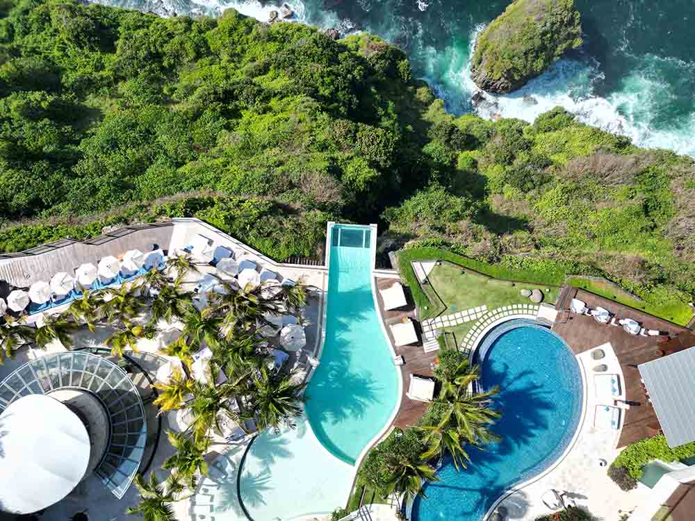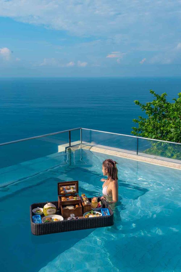 ハイライトは崖から約6mにわたって突き出す、ガラス張りのスカイプール。足元はガラス張りで、真下には海が広がりスリル満点!憧れのフローティング・ブレックファストは宿泊者限定。「ザ・エッジ」に宿泊したときは、ぜひ体験してみてくださいね。