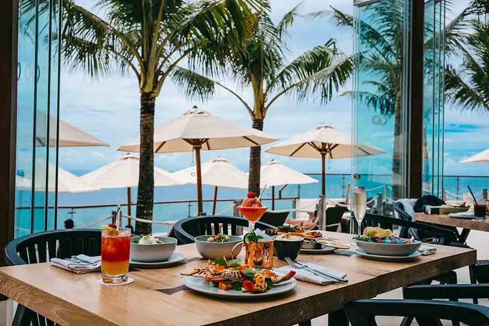 オーシャンビューのレストランでは、優雅に食事が楽しめます♪ハンバーガーやパスタをはじめ、ヴィーガン対応のメニューも豊富に揃います。