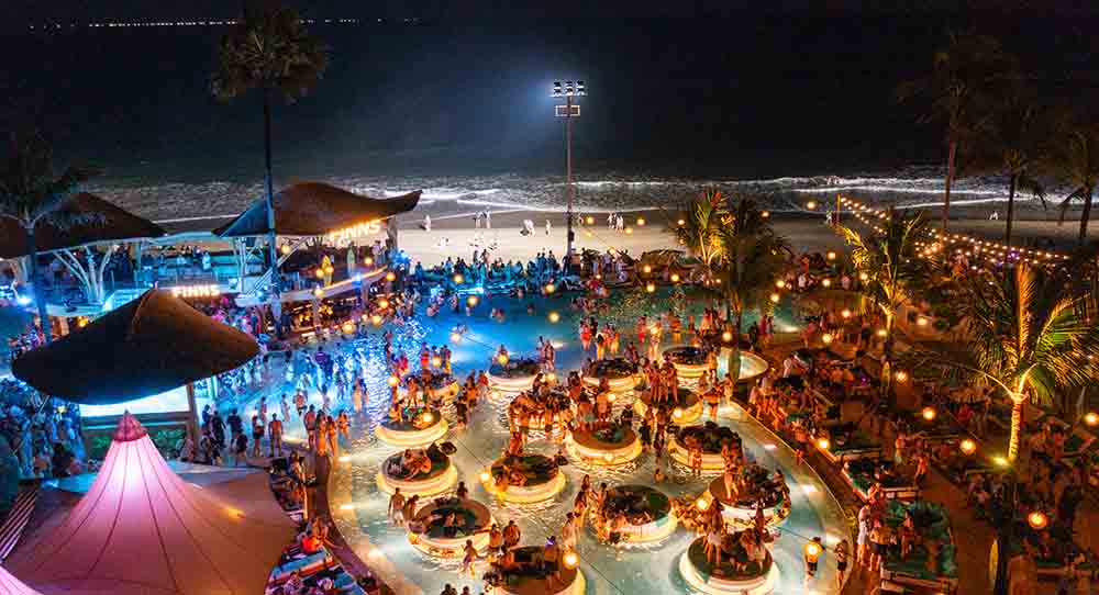 夜はクラブ全体がライトアップして盛り上がりも最高潮!ナイトイベントでは国際的なアーティストを招いたライブが開催されています。2025年にはナイトクラブ、新しいダイニング、ビアガーデンなどがオープン予定。今後もますます目が離せない、注目のビーチクラブです。