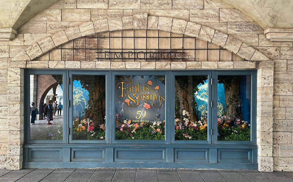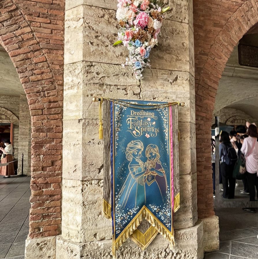 通路にもバナーが登場。花なども飾れられてファンタジースプリングスの雰囲気を演出しています。
