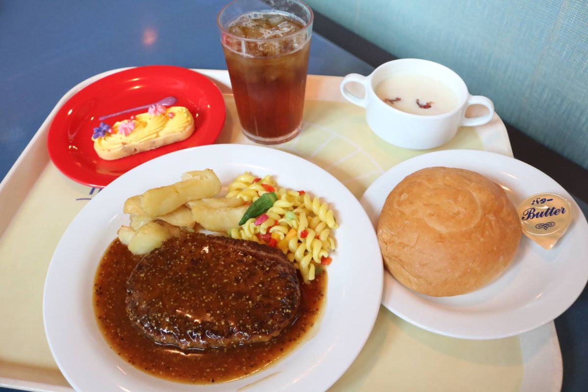 メインはランタンが浮かぶ夜空をイメージしたというハニーマスタードソースがかかったハンバーグ。マスタードの味はきつくないので、辛味が苦手な方でもおいしく食べられます。付け合わせはラプンツェルの魔法の髪をイメージしたフジッリパスタにカラフルな野菜で花を表現。中央のオクラは、カメレオンのパスカルをイメージしているそうですよ。