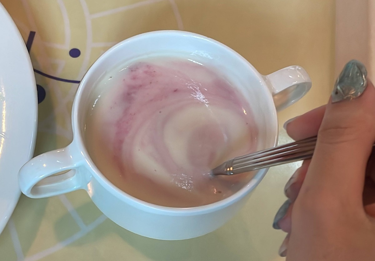 ポテトと紅芋のポタージュは、混ぜると色が変化する楽しみも。中に入ったベーコンとポテトポタージュの甘みがマッチしていておかわりしたくなるおいしさ。