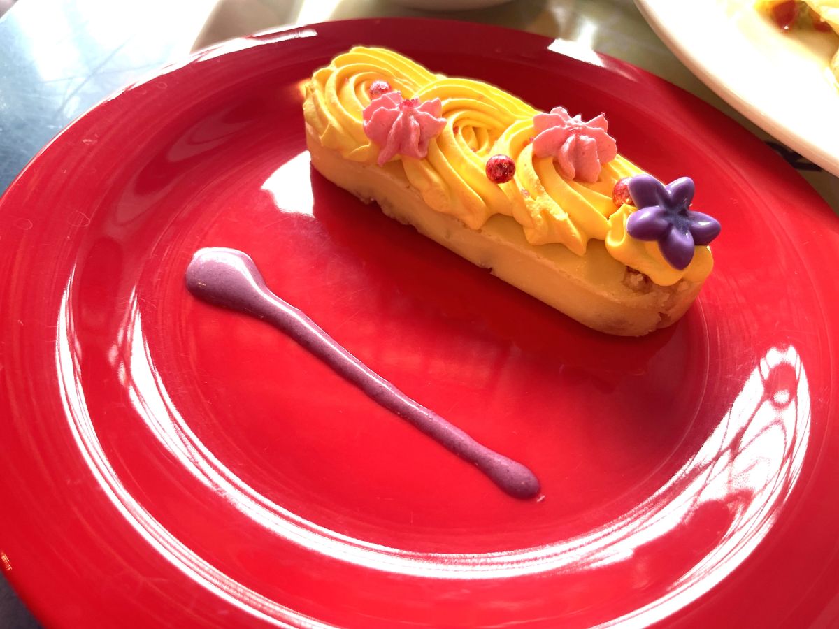 デザートもラプンツェルの髪をイメージしたもの。レモンクリームのチーズケーキは見た目のかわいさがそのまま味になったような、優しい味わいのスイーツ。甘さ控えめでボリュームたっぷりなセットメニューの締めくくりにぴったりなデザートです。