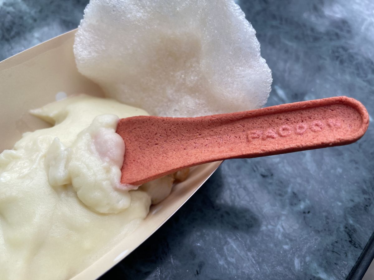 一部のメニューには食べられるスプーンで提供しています。味はちょっと甘みのある、固いビスケットのような感じ。取材時は「ホタテ貝のマッシュポテト、シュリンプチップ添え」と一緒にいただきましたが、塩味のあるマッシュポテトによく合う味わいでした。食べるスプーン単体で食べてもおいしいので、一度試してみて!