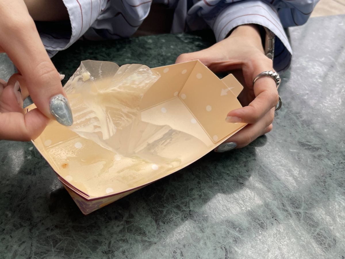 「ホタテ貝のマッシュポテト、シュリンプチップ添え」の容器にもサステイナブルな取り組みが。内側のシートが取り外せてリサイクルできる仕様になっています。