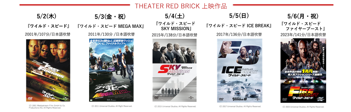 そして上映されるのは、世界中で圧倒的な人気を誇るノンストップ・カーアクション『ワイルド・スピード』シリーズから5作品を特集します。シリーズ第1作目『ワイルド・スピード』から始まり、ファン人気も高い『ワイルド・スピードMEGA MAX』、『ワイルド・スピード SKY MISSON』、『ワイルド・スピードICE BREAK』、2023年公開された最新作『ワイルド・スピード ファイヤーブースト』をピックアップ!5.1chサラウンドが織りなすリアリティあふれる音響と飽きのこない大迫力ある映像で『ワイルド・スピード』の世界観を思う存分堪能しましょう!