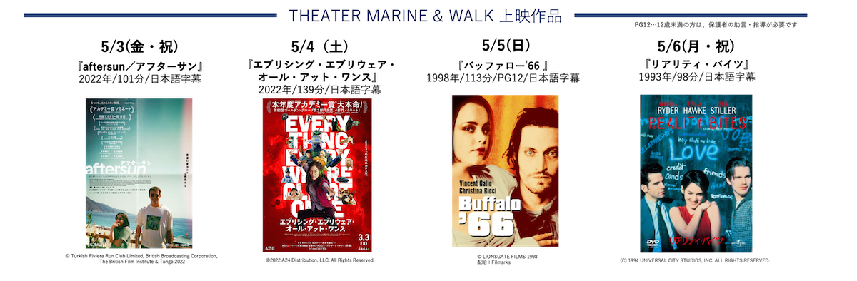 「THEATER MARINE & WALK」では、みなとみらいの夜景と波の音を感じる海辺の特別なロケーションにスクリーンを特設!本会場では作家性が爆発した作品の豊富さから映画ファンの人気を集める新進気鋭の映画スタジオ「A24」作品を特集します。上映作品は、2023年アカデミー賞にて監督賞を含む7部門を受賞した『エブリシング・エブリウェア・オール・アット・ワンス』、同じく主演男優賞にノミネートされた『aftersun/アフターサン』、90年代の名作として当時ミニシアターを中心に大きな話題を生んだ『バッファロー’66』、ウィノナ・ライダー主演の『リアリティ・バイツ』の4作品がラインナップ!MARINE & WALK YOKOHAMAの飲食店舗でテイクアウトしたおいしい食事を食べながら、いつもと違う映画体験を楽しんでみて。
