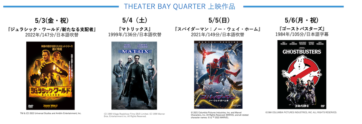 潮風を感じながら買い物やグルメが楽しめるショッピングモール・横浜ベイクォーターのシアターでは、主人公やキャラクターが魅力的な映画をセレクト。大ヒットシリーズの最新作となる『スパイダーマン:ノー・ウェイ・ホーム』『ジュラシック・ワールド/新たなる支配者』、今年で40周年を迎えるSFアクションコメディの金字塔『ゴーストバスターズ』やキアヌ・リーブス主演のSF人気作品『マトリックス』が4夜連続で上映されます。さらに、当日コスプレをしてきた来場者にはお菓子をプレゼント!また、日中は館内でオリジナルのタトゥーシールがもらえる謎解きラリーイベント「ベイクォーターと勇者の冒険」も同時開催されますよ。