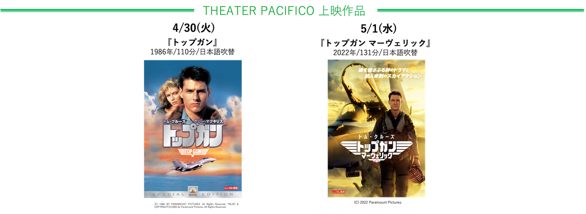 パシフィコ横浜では、目の前に海と空が広がる国⽴⼤ホールマリンロビーに大型スクリーンを設置!初日は全世界が熱狂し、トム・クルーズを一躍スターダムの頂点へとのし上げたアクション超大作『トップガン』、2日目は切望されていた続編『トップガン マーヴェリック』がそれぞれ上映されます。キッチンカーのできたてフードを楽しみながら、普段はなかなか入ることができない非日常空間で、トムクルーズ体当たりのスカイ・アクションに没入してみて。