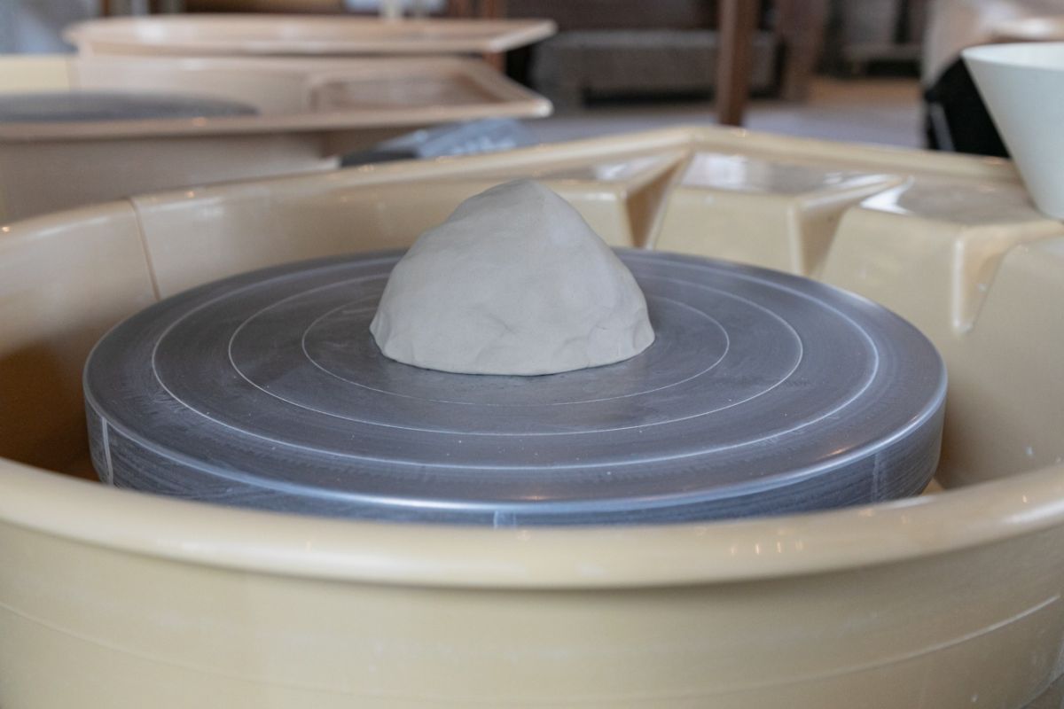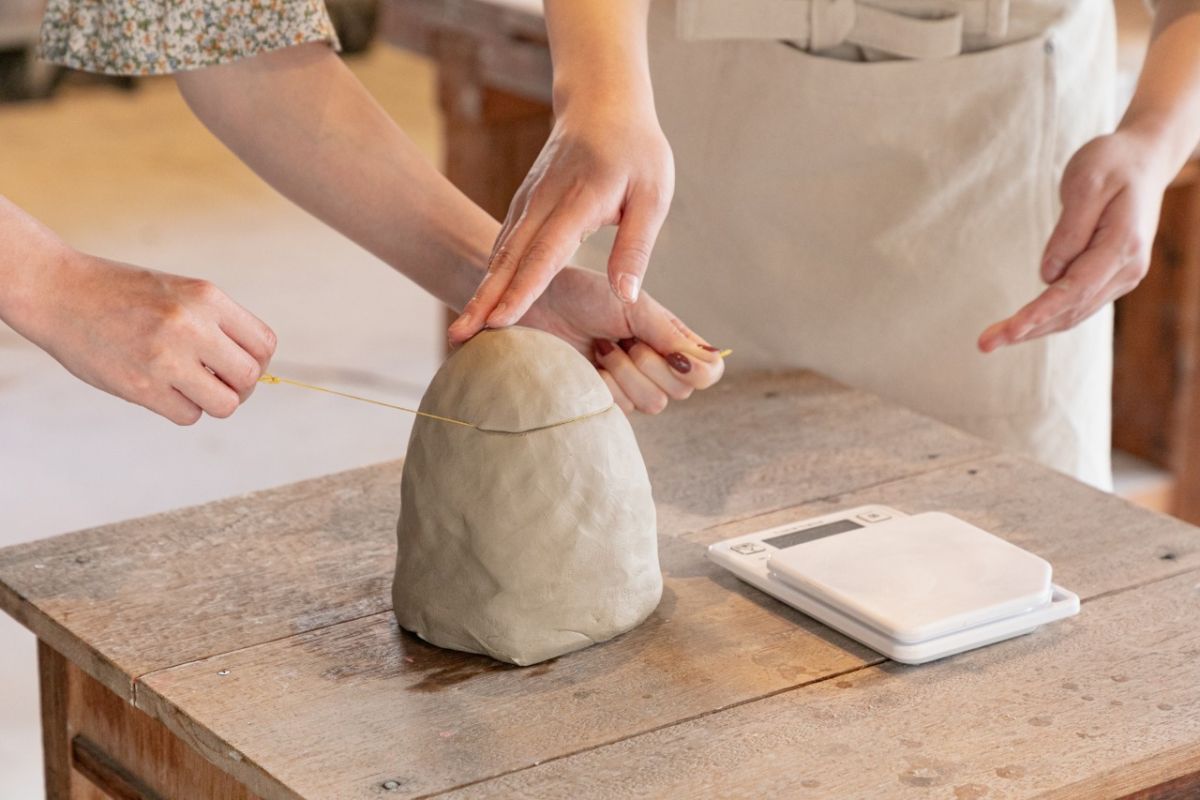 いざ実践!作りやすい土の量が400~450gで、その量を大きな土のかたまりから自分でカットします。400g~450gの土は、「お茶碗」「おちょこ」「湯のみ」「中皿」などが作れます(作る作品の種類は、予約時ではなく当日決めます)。店内を見渡すとすでに体験された方が作った作品があるので、それらを眺めながら、自分の使う土がここからどんな形になるのか期待を膨らませます。
