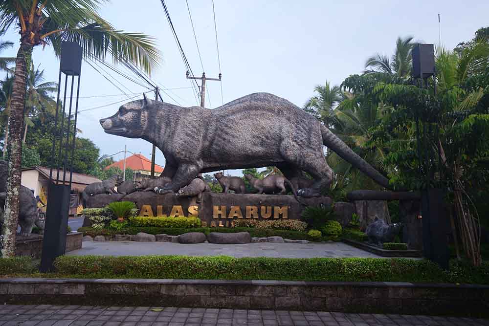 「アラス・ハルム・バリ」はウブド中心部から車で約30分。美しい棚田が広がる観光名所、トゥガララン棚田の近くにあります。施設の目印は大きなジャコウネコの石像。入園料は1人Rp.5万で、後でご紹介するコーヒーツアーもこの入園料に含まれています。ジャングル・ブランコやプールの利用は別途料金が必要です。当日入場も可能ですが、ハイシーズンはオンラインでの事前予約がおすすめです。