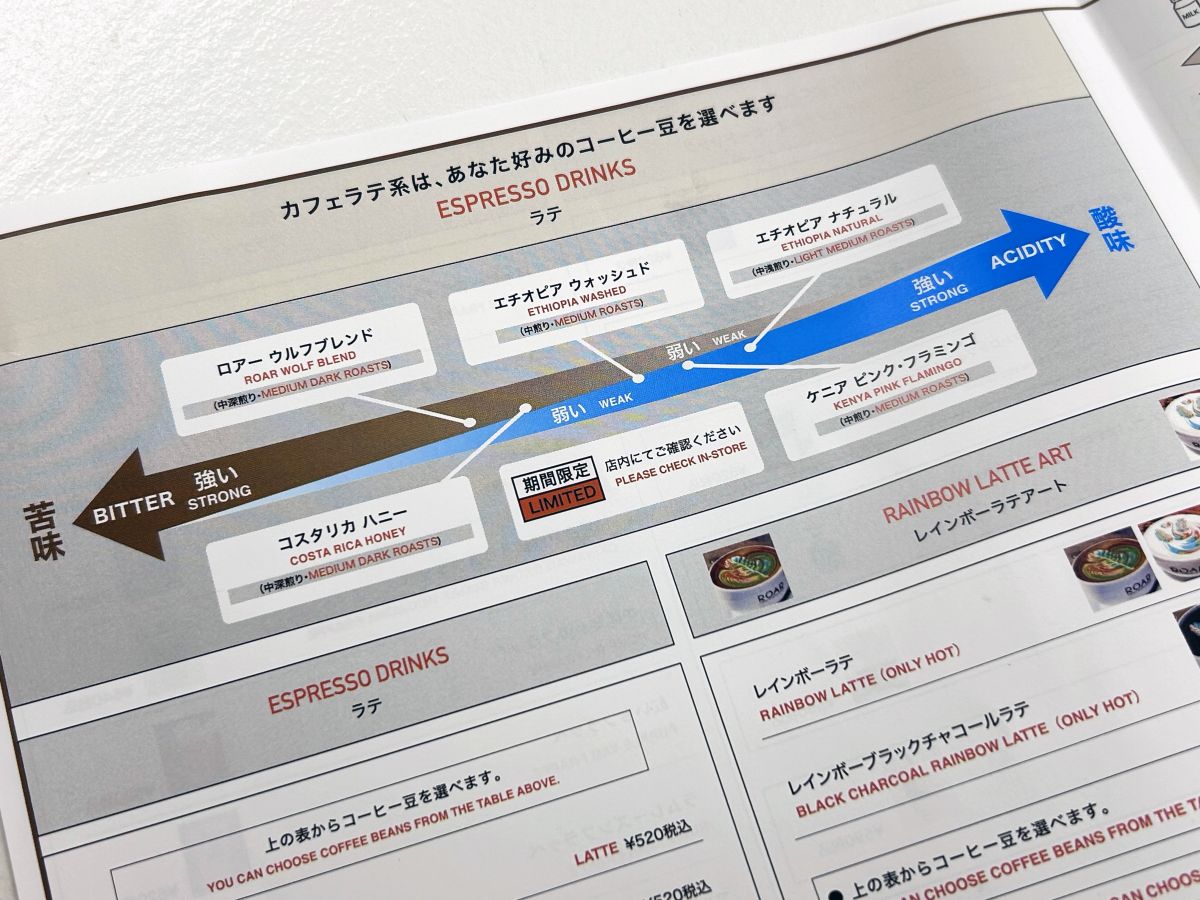 「ROAR COFFEE」が日本で初めて提供したというレインボーラテをはじめ、各種エスプレッソドリンクやハンドドリップで抽出するドリップコーヒーなど、ドリンクメニューが充実しています。