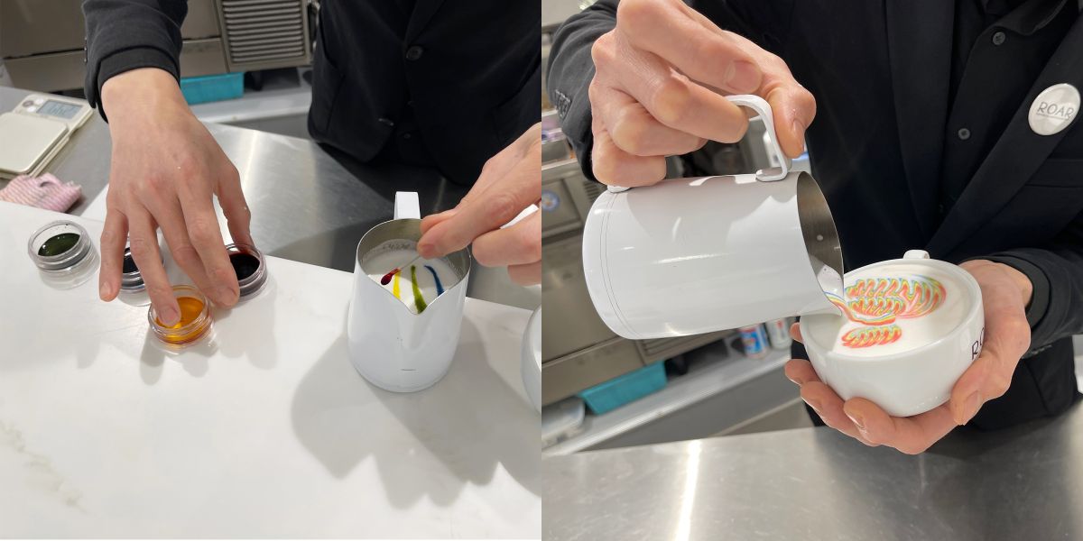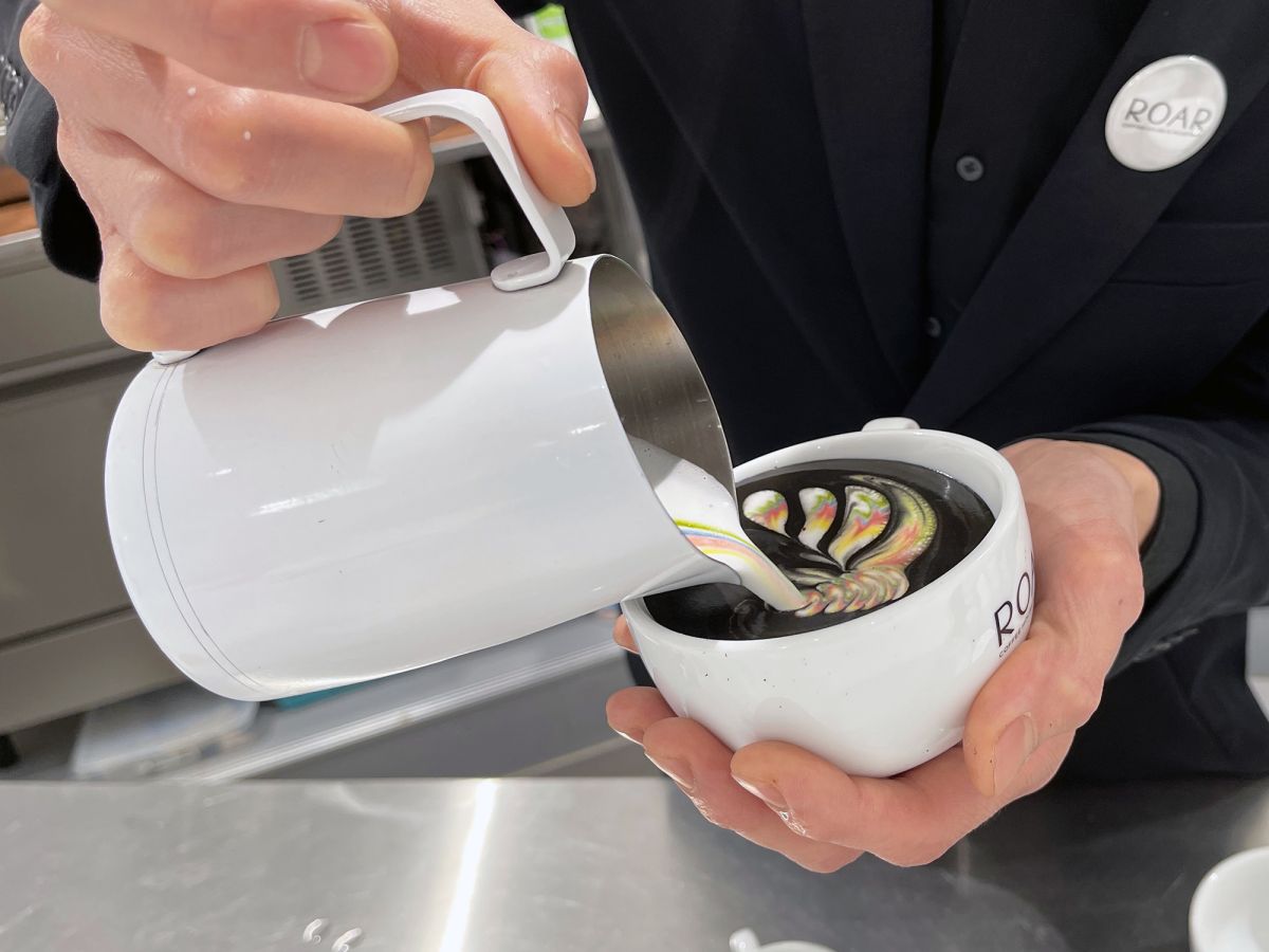 カウンター席なら、ラテアートを施している手元をじっくり観察できます。まるで魔法のように手際よくあざやかに描かれていくレインボーラテアートにうっとり。