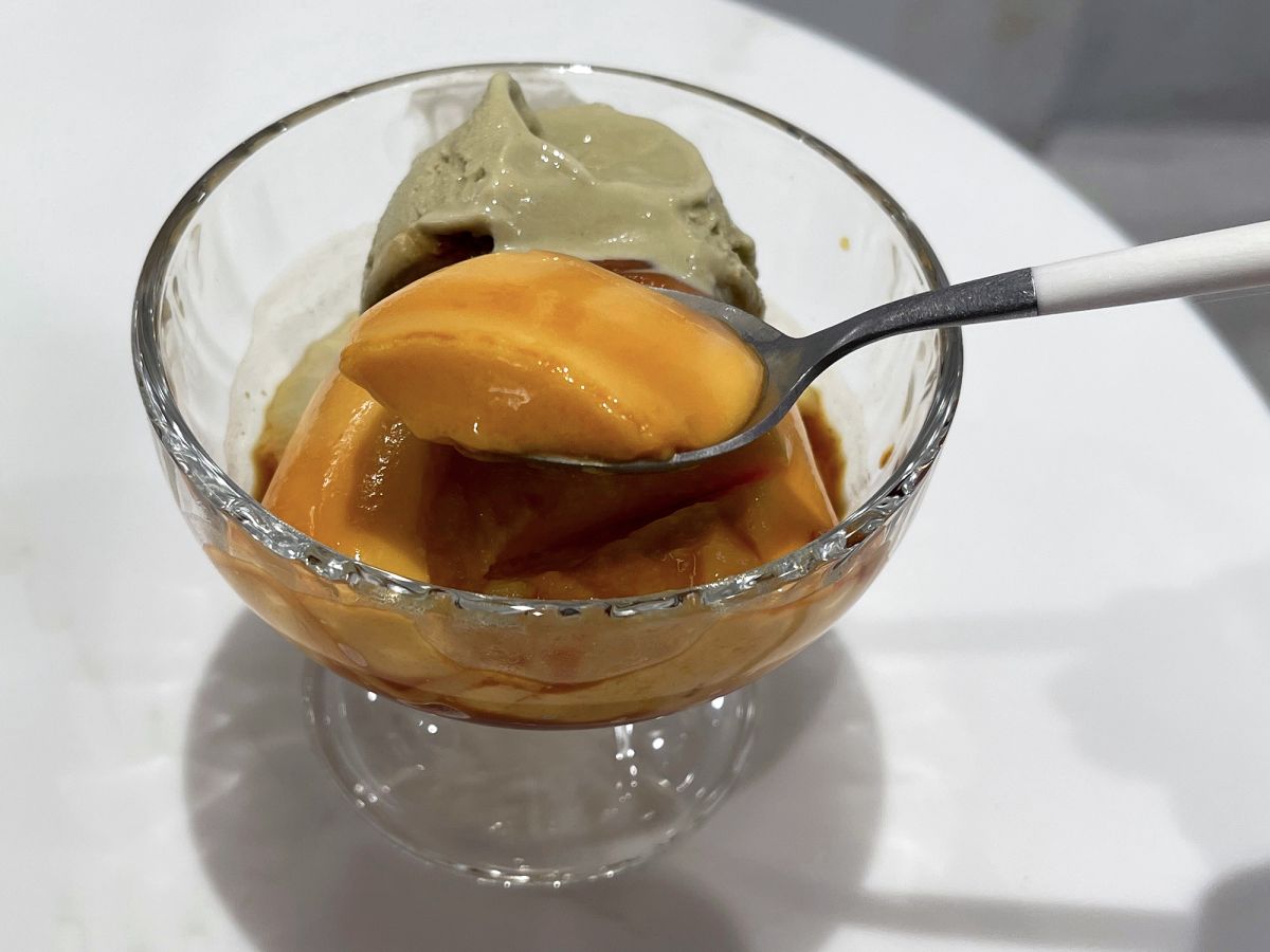 ピスタチオアイスもしっかりとナッツの風味を感じられ、なめらかなプリンとの相性もばっちりです。