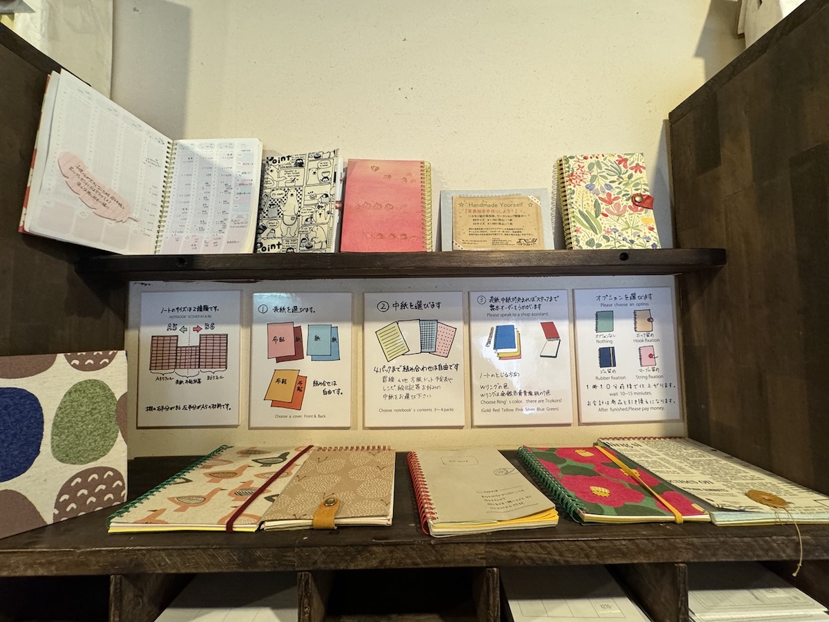 ノートの種類はA5、B6、B6縦半分ノート、ミニノートの4種類。店内にある商品を組み合わせて作っていきます。