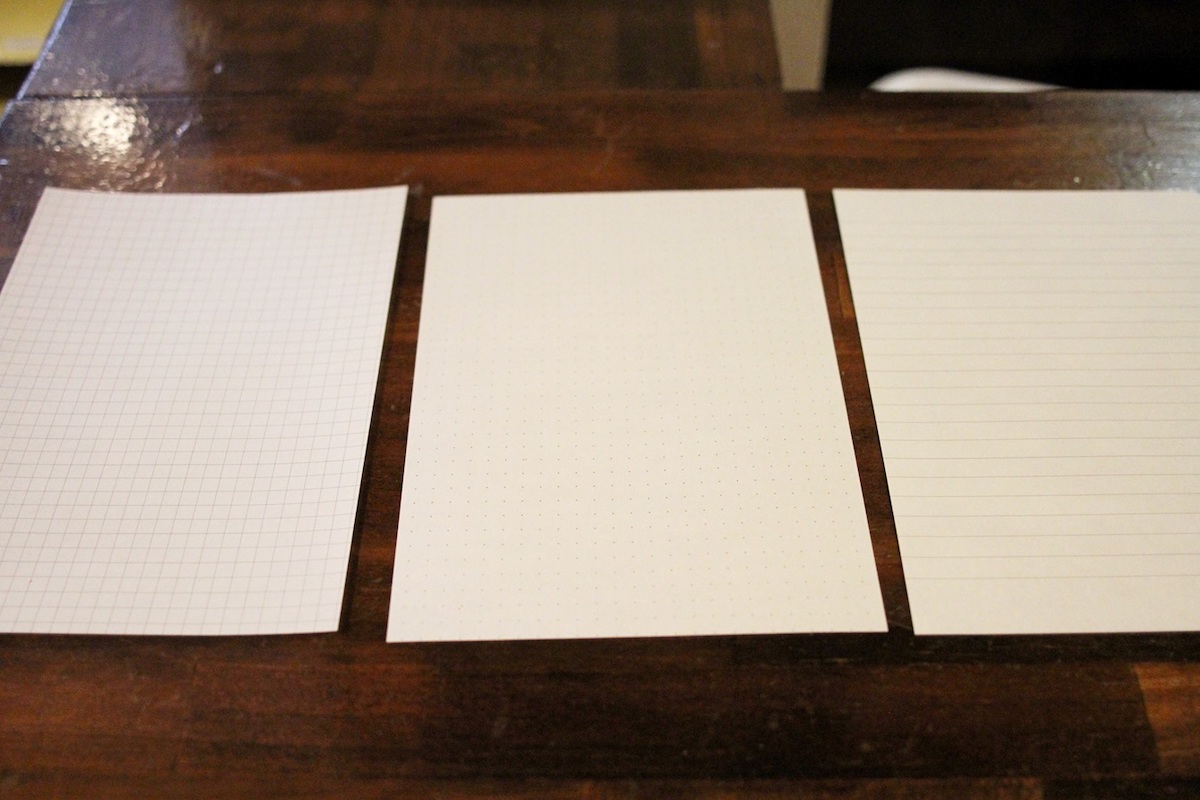 例えばA5、B6ノートのメモ用中紙ひとつとっても、無地、罫線、マス目があったり、色が違うものがあったりと種類もさまざま。