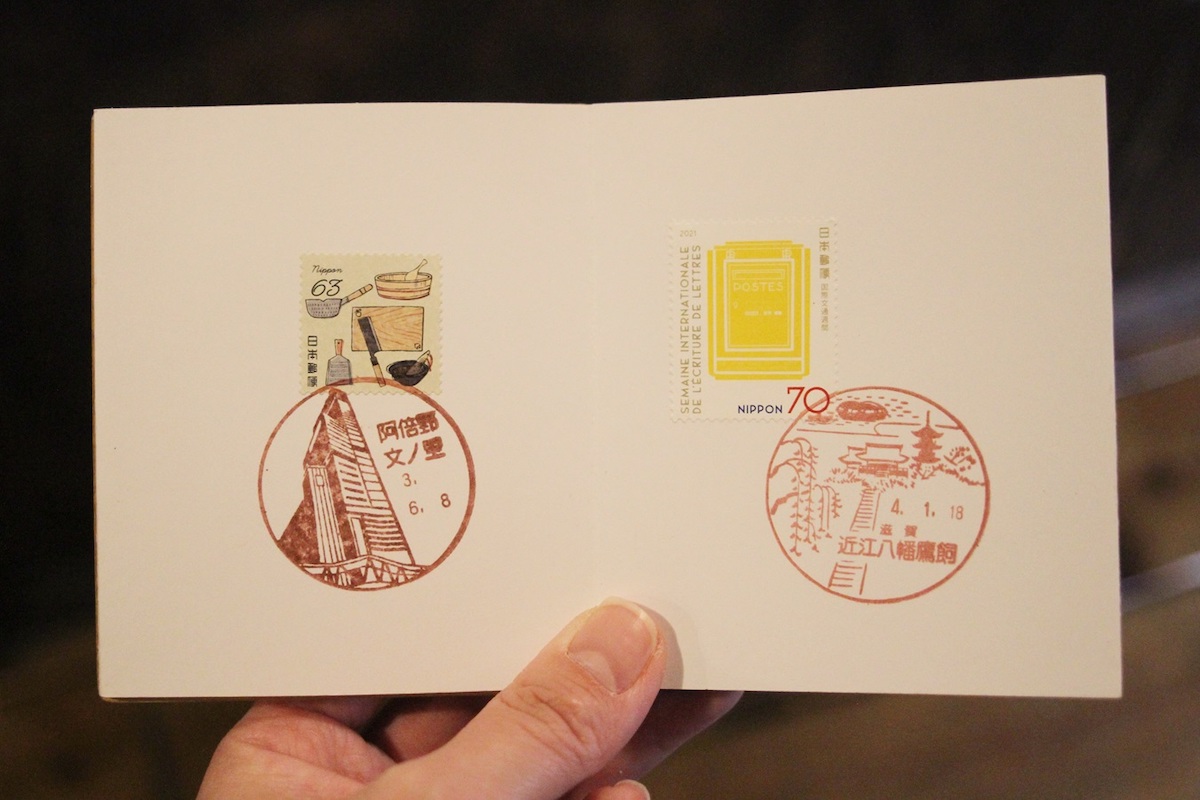 戦前から行われているサービスで、写真のように切手を貼ればその上にハンコが押してもらえるというもの。あくまでも「消印」なので、切手が必要になりますが、有名な観光スポットなど郵便局ごとにデザインが異なります。旅先の郵便局で、旅の記念として「風景印」を集めるのもおもしろそうですよね。