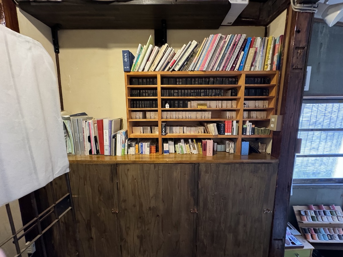 「エモジ」を訪れたら、ぜひチェックしてみてほしいのが2階の本棚です。ここに並んでいるのは紙の素材本や色の見本帳といった紙に関する専門書。紙のプロである店主が集めたもので、なかには一般の書店には流通していない資料もあります。