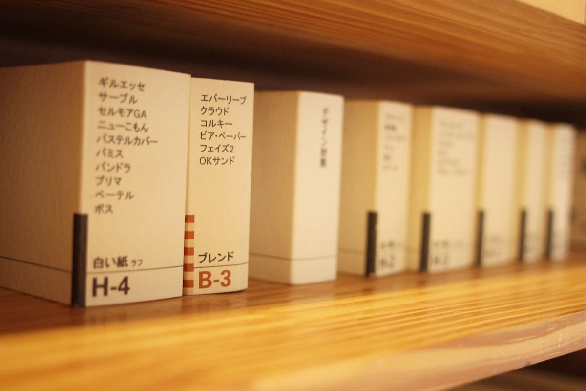 見本のノートもいくつか置いてあるので、参考にしながら作ると◎。どれにしようか迷ったときは、紙のプロである店主に相談してみるのもいいですね。選ぶ作業はとても楽しく、なかには1時間ほどじっくりかけて紙選びをする人もいるそう。