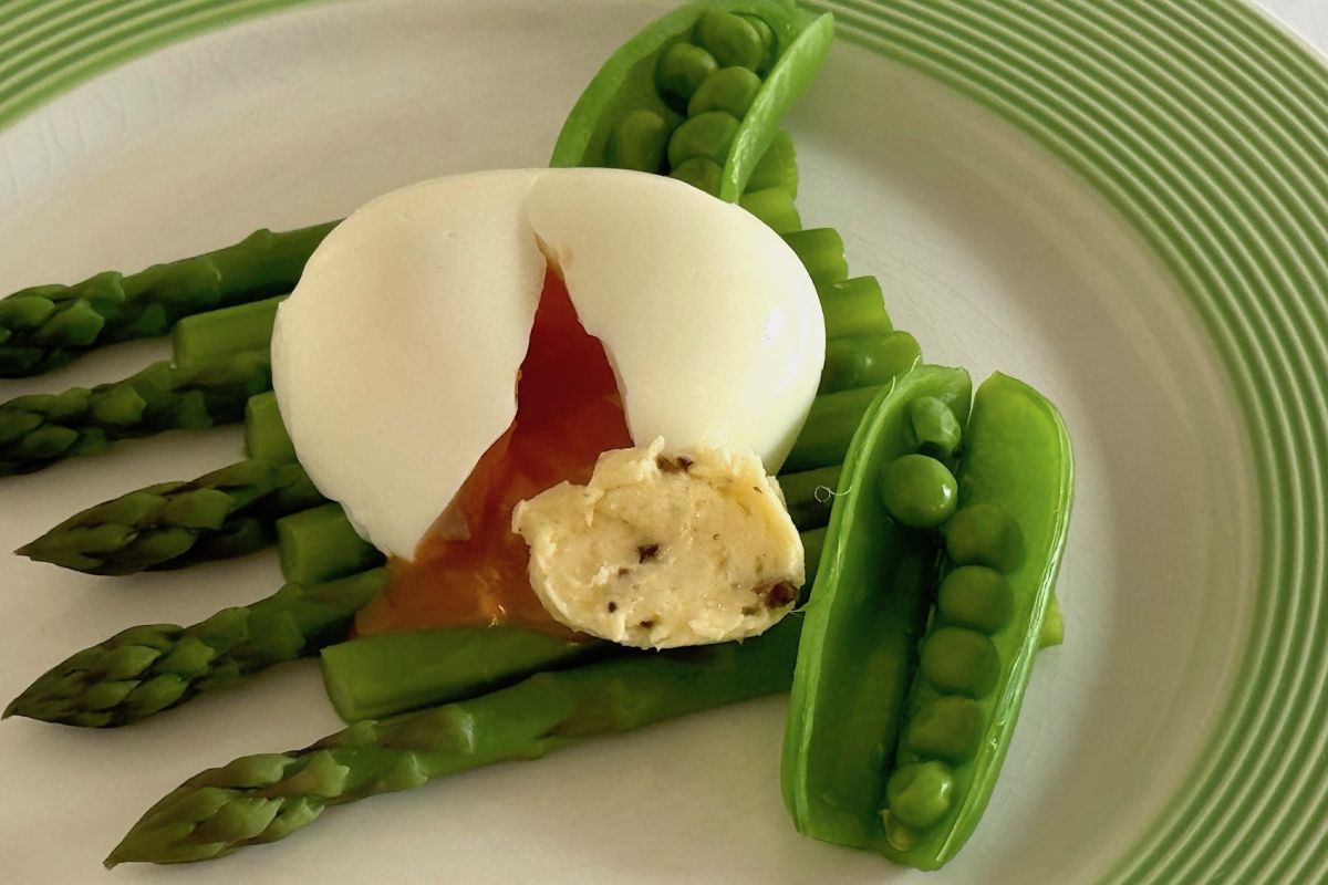 アスパラガスやスナップエンドウなど、初夏に出回る野菜を塩ゆでして、半熟卵とともに味わいます。とろりと流れ出る黄身のソースと「トリュフベーカリー 白トリュフバター」を合わせると、トリュフの香りとバターのコクで、ワンランク上のサラダに。