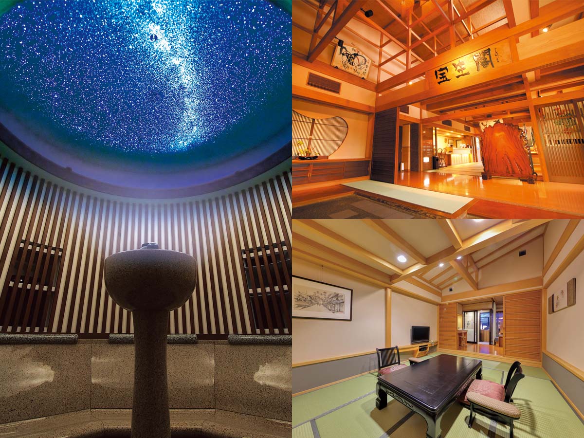 館内は吹き抜けの玄関や心地よい畳廊下など温かみのある和空間で、飛騨の匠の技が至る所に光っています。最上階の客室はすべて露天風呂付き。湯処も豊富で、特に人気があるのは女性客限定の湯あそび処「織姫」です。2つの展望露天風呂やプラネタリウムとアロマに満たされたテルマリウムなどで、リラックスできる空間です。