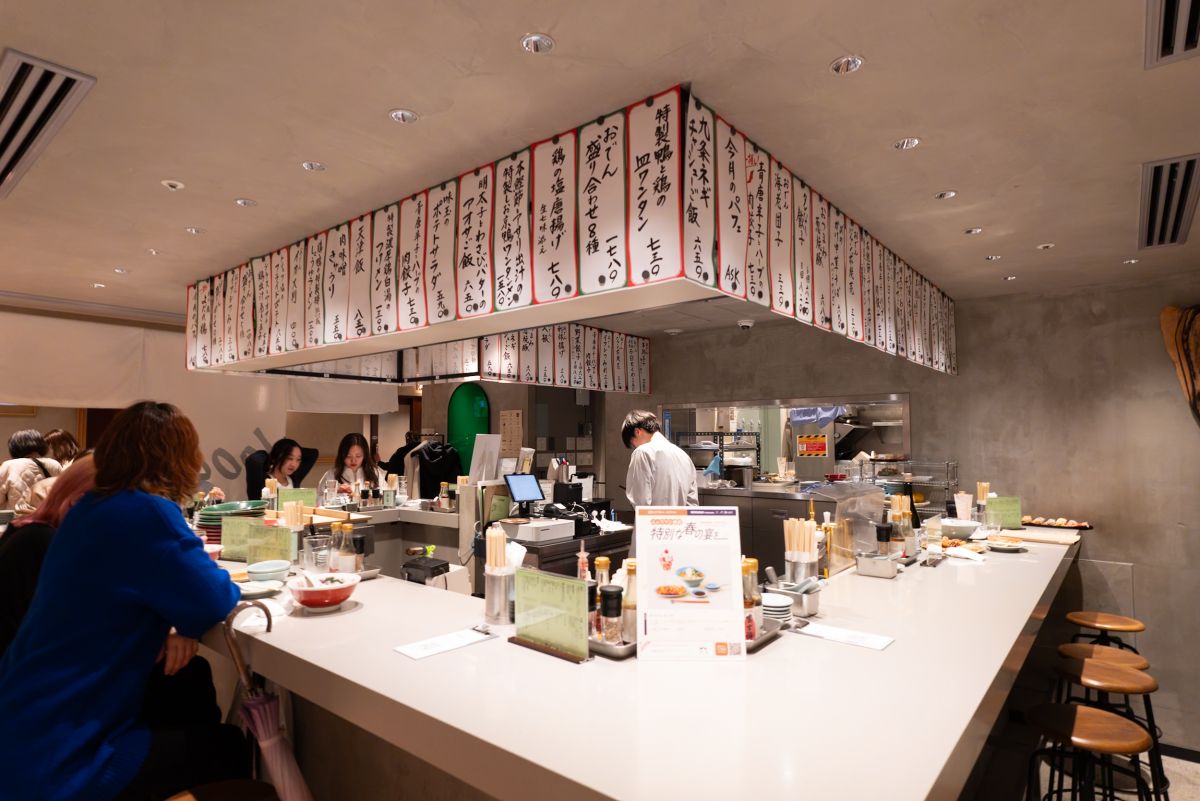 NEWoMan横浜8階のレストランフロアにある「Nood e」。コンクリート打ちっぱなしのカウンターがスタイリッシュで、女性ひとりでも入りやすい雰囲気が魅力です。