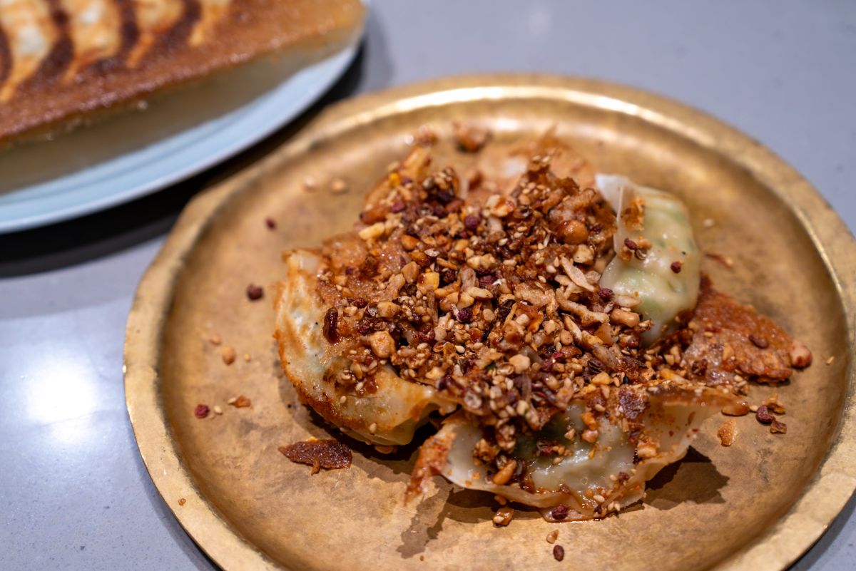 「Nood e」には一風変わった餃子も。こちらはたっぷりのスパイスがかかった「花山椒の麻辣餃子」830円。舌がピリリとしびれるような辛さが後ひくおいしさで、お酒のつまみにもぴったり。辛いけどやめられない、中毒性のある味わいです。