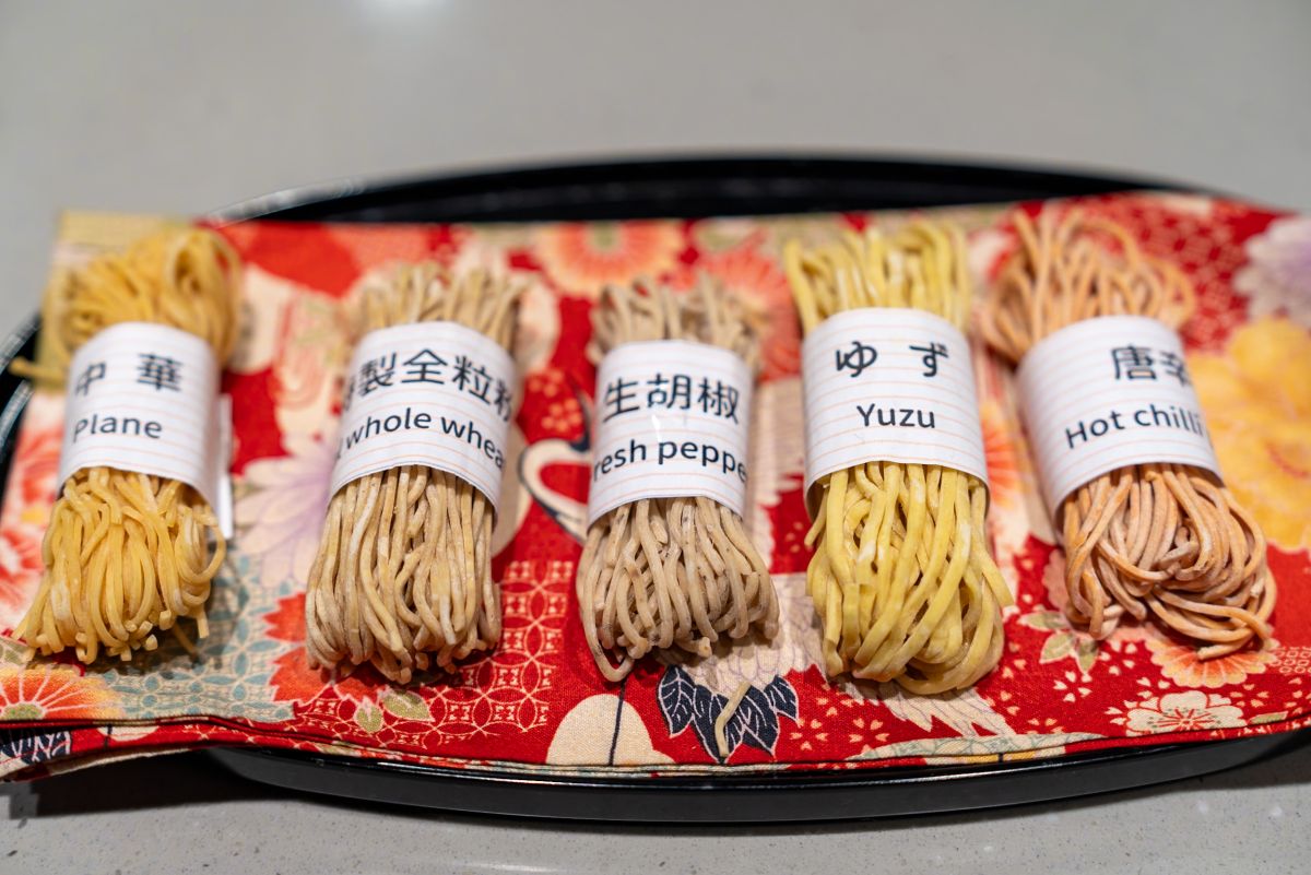 〆のラーメンは、どのメニューでも日によって異なる5種の麺から選ぶことができます。この日は中華、特製全粒粉、生胡椒、ゆず、唐辛子がラインアップ。一番人気は中華とのことですが、さっぱりとしたゆずが練り込まれた麺も人気だそう。