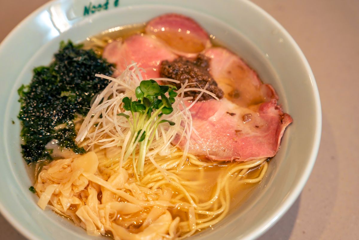 こちらが一番人気の「本鰹節とアサリ出汁の特製しおラーメン」1200円。鰹とアサリ、鶏のだしをブレンドしたスープがよく絡む細麺に、トリュフオイルとキノコをベースにしたデュクセルソースがかかったフレンチのような逸品です。あっさりとした味わいなので、餃子をしっかり食べた後でもペロリと食べることができます。