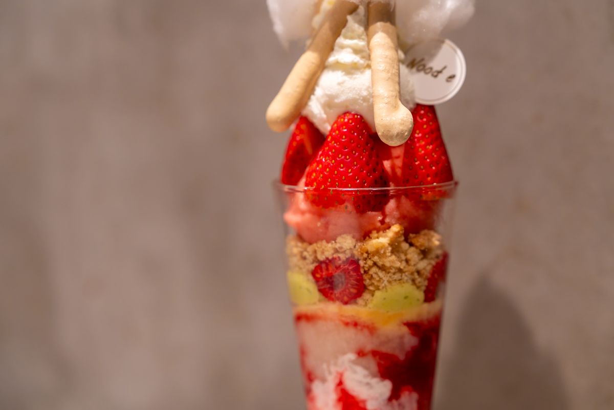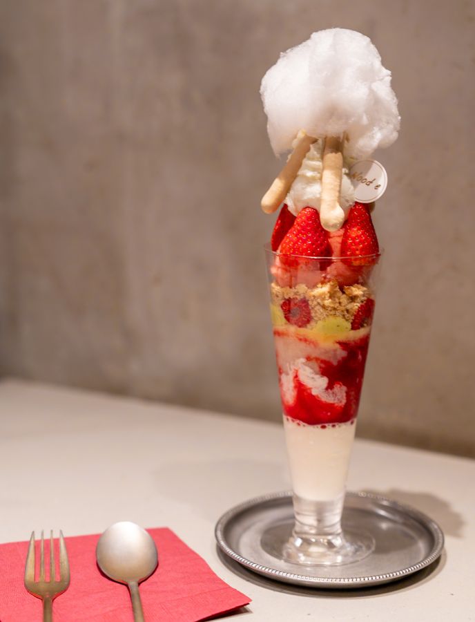 ここまではおしゃれでおいしい餃子とラーメンを紹介してきましたが、「Nood e」が特別なのは、〆のさらに〆としてパフェも提供しているということ。月替わりで旬の食材を贅沢に使用したパフェやプリンアラモードを提供していて、取材時(2024年3月)は「苺とフロマージュブランのパフェ」2180円をオーダー。その場で作るふわふわの綿あめがインパクト大のパフェとなっています。