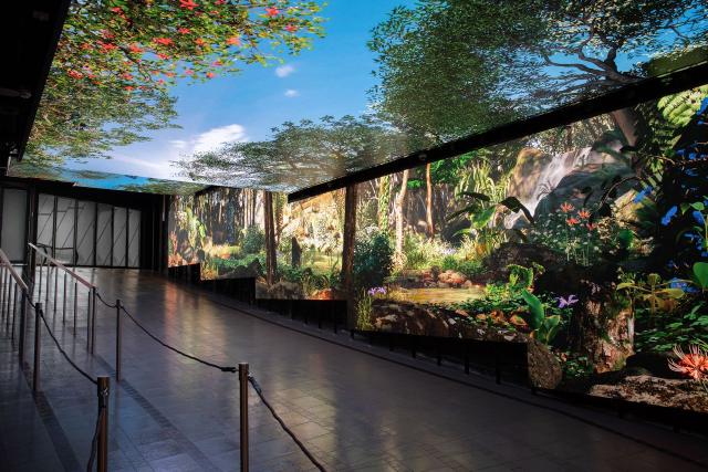 MTRの金鐘(アドミラルティ)駅で降りたら、さっそく「THE PEAK TRAM」の駅へ向かいましょう。構内のトラムに向かう導線には、ピークに生息するさまざまな野生動物を没入感あふれる映像体験で紹介する「ゴー・ワイルド・アット・ザ・ピーク(Go Wild At The Peak)」というエリアが。ここも今回のリニューアルで新しくできたスポットです。