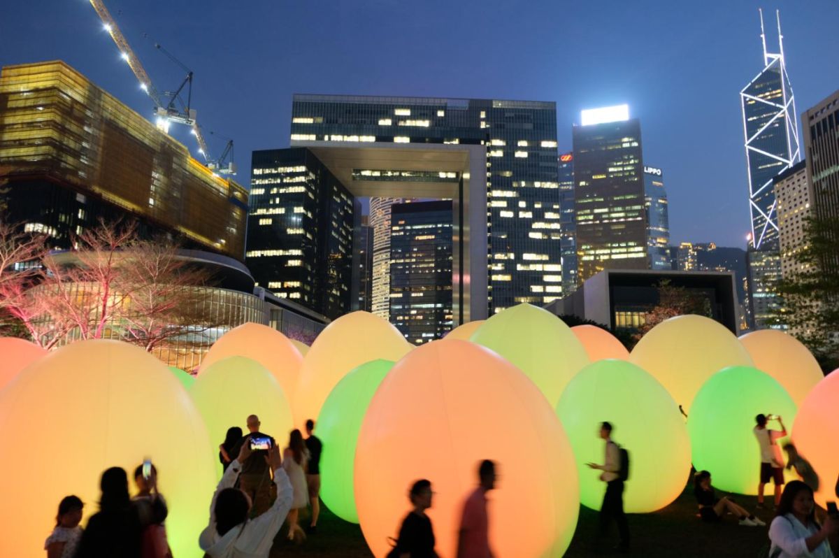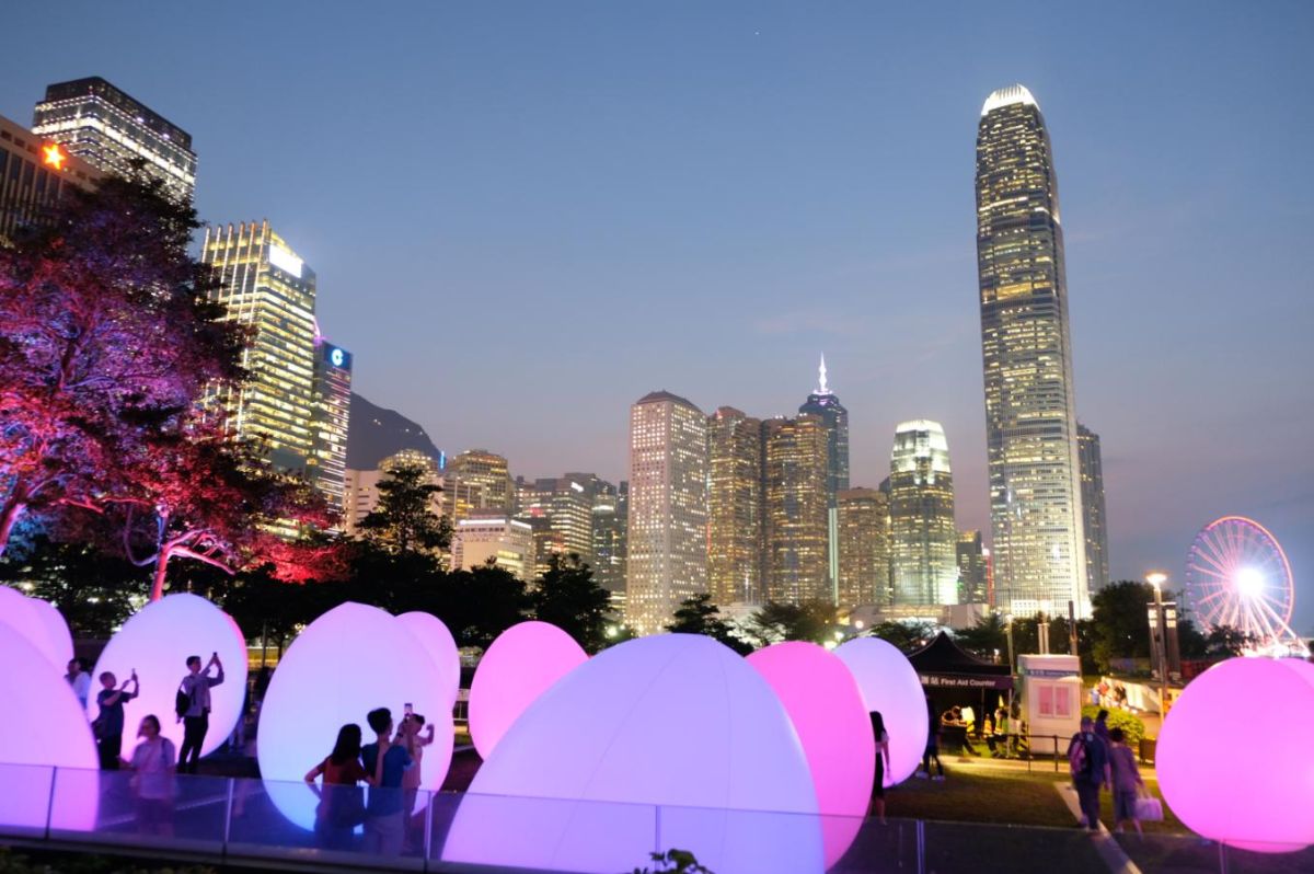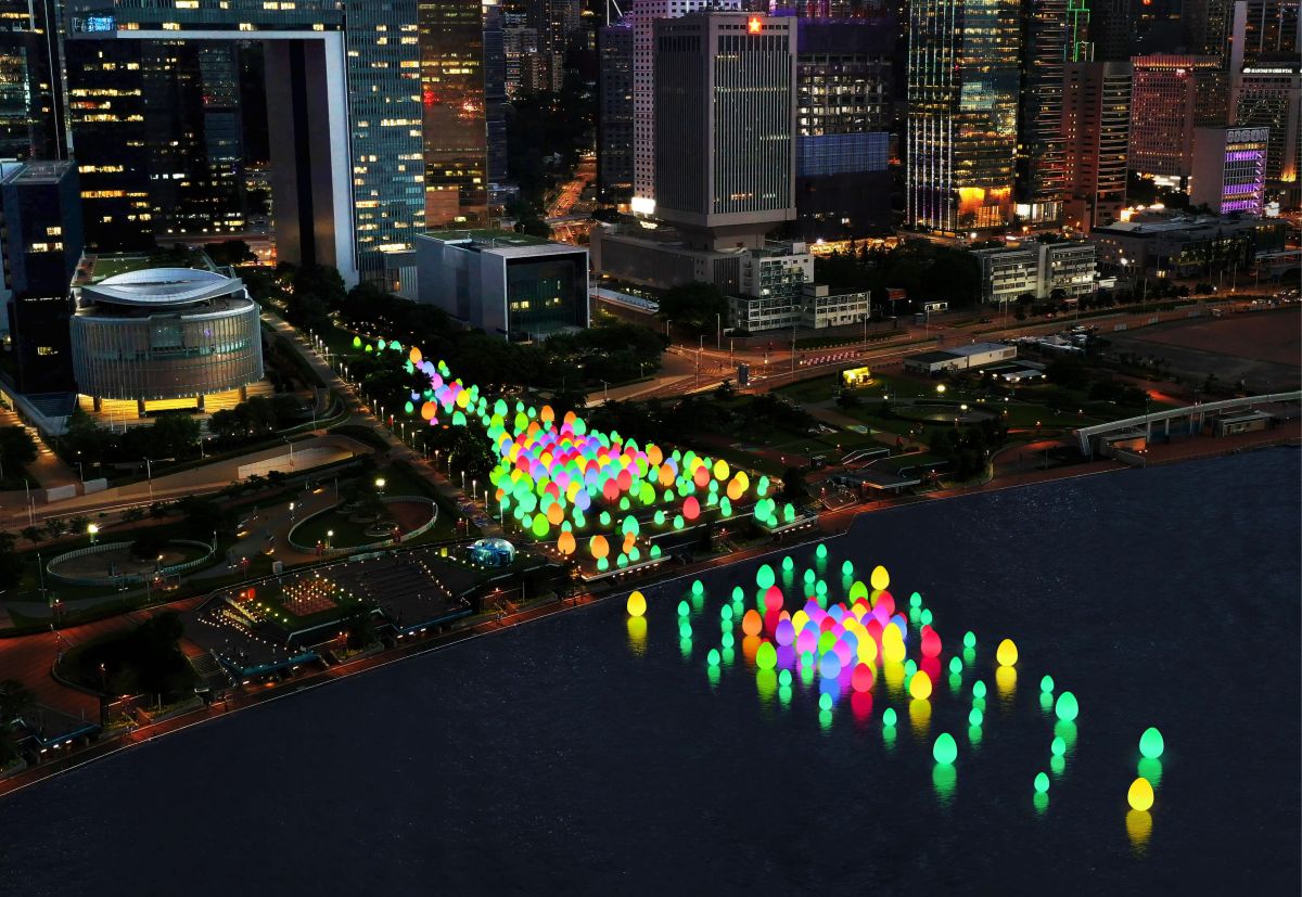 夜はやっぱり香港の夜景を見たい!そんな方にぜひ訪れてほしいのが2024年6月2日までの期間限定で開催している日本のチームラボによる「teamLab: Continuous」。写真に映っている色鮮やかに光る卵形体のオブジェはオボイド(ovoid)とよばれるもの。数百のオボイドがタマール公園(添馬公園)からビクトリアハーバーにかけて配置されています。