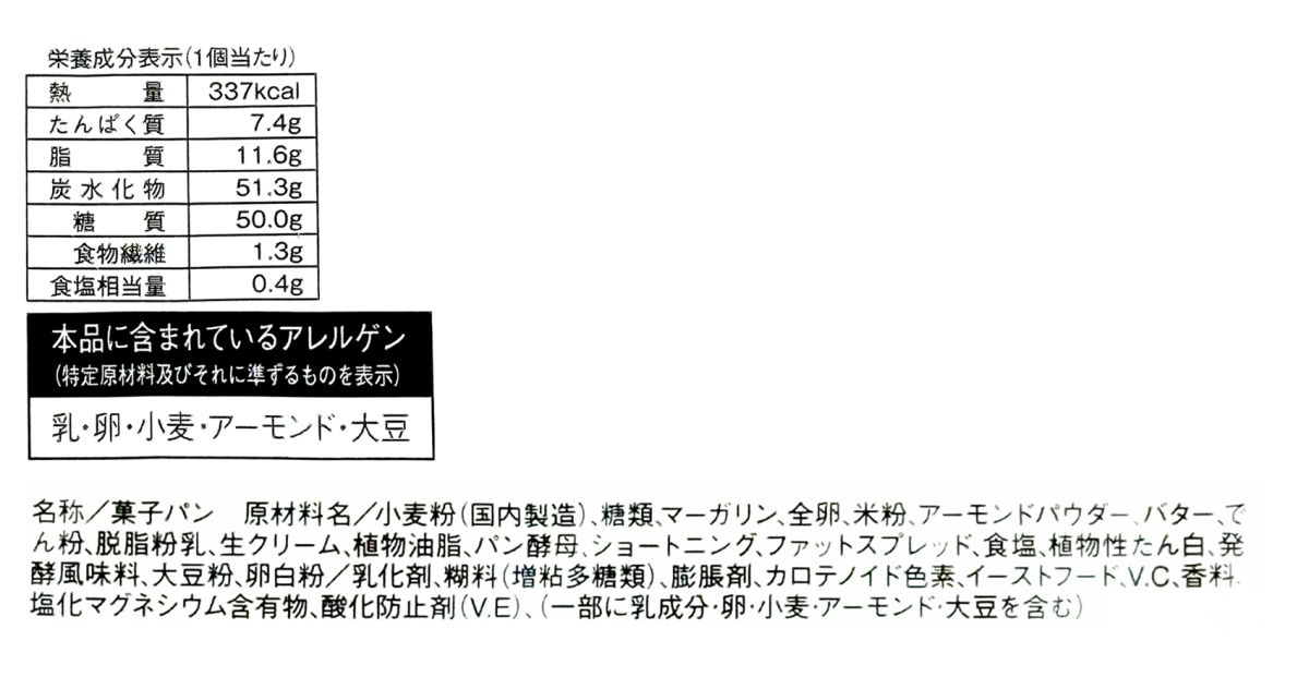 気になるカロリーは1個337kcal、糖質は50.0gです。