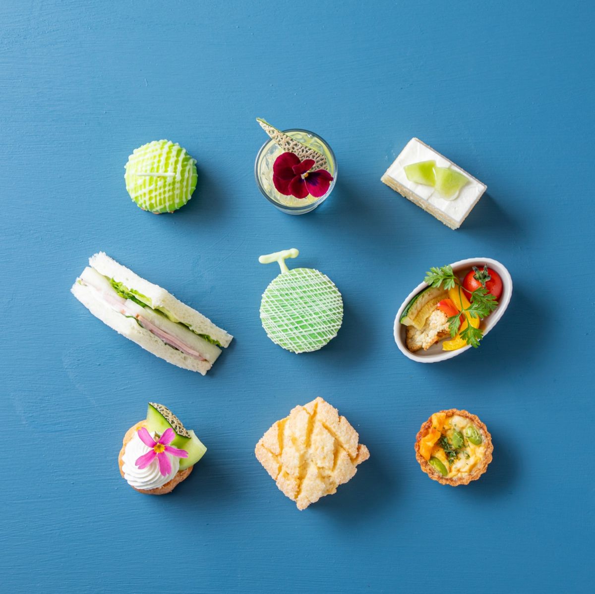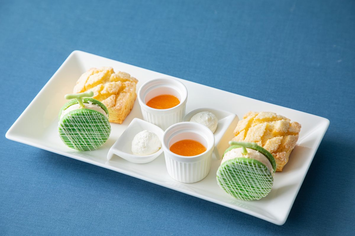 スイーツは、メロンとマスカットのジュレを合わせた清涼感が楽しめる杏仁や、鮮やかなオレンジ色の果肉が特徴の赤肉メロンをイメージしたムース、昨年好評だった「スコーンのメロンパン仕立て」など全6品。セイボリーには「メロンとハムのサンドウィッチ」など全3品と、見た目も味わいも多彩です。