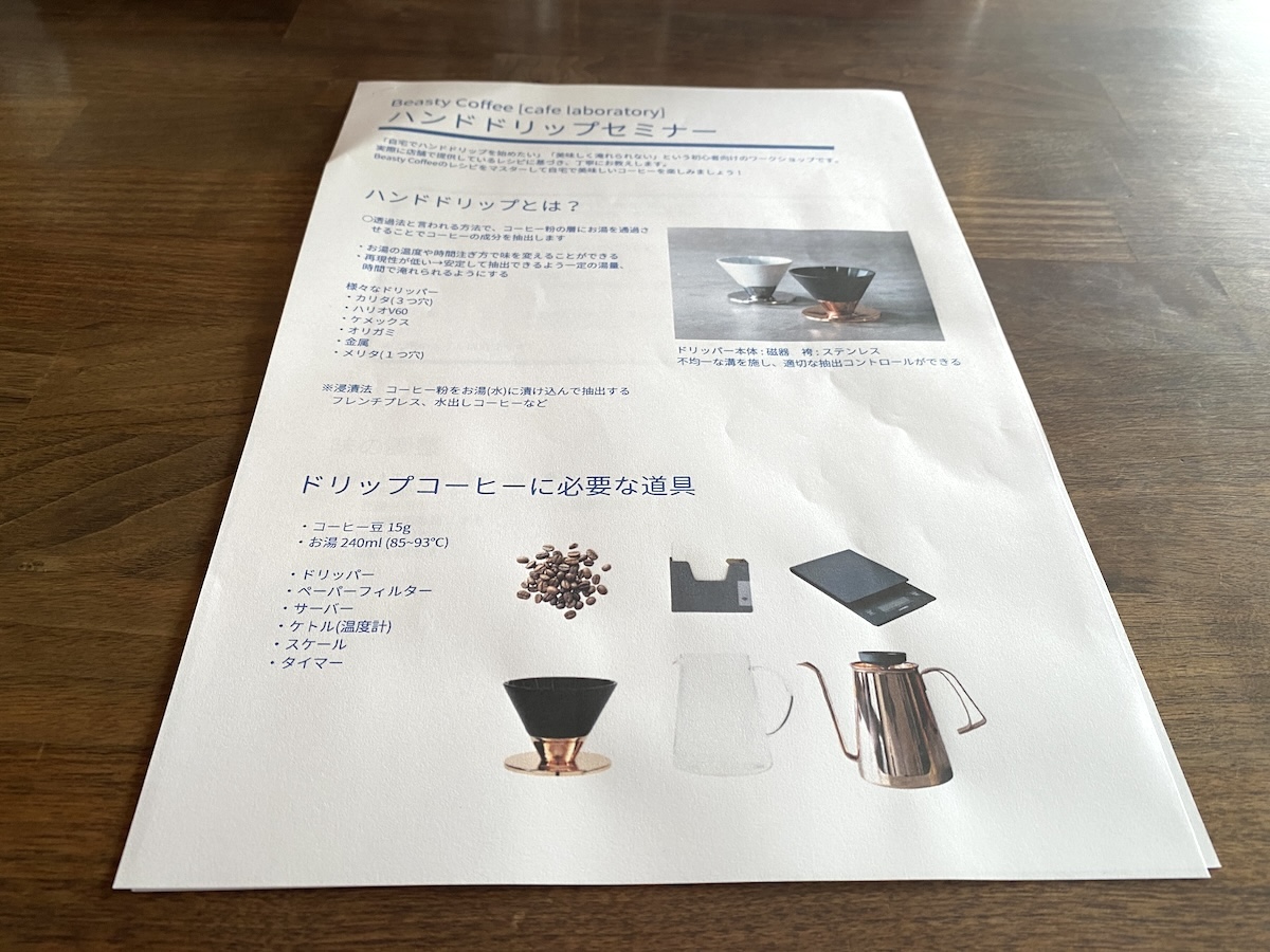 今回参加したのは「ハンドドリップセミナー」。「BeastyCoffee cafe laboratory」で提供しているコーヒーのレシピに基づいた入れ方を丁寧に教えてくれるので初心者でも安心です。コースが2種類あり、ドリッパーがもらえるコース6000円とドリッパーがついていないコース3000円、どちらかをチョイスします。体験してから購入を検討したい人、すでにドリッパーを持っている人は3000円のコースがおすすめです。