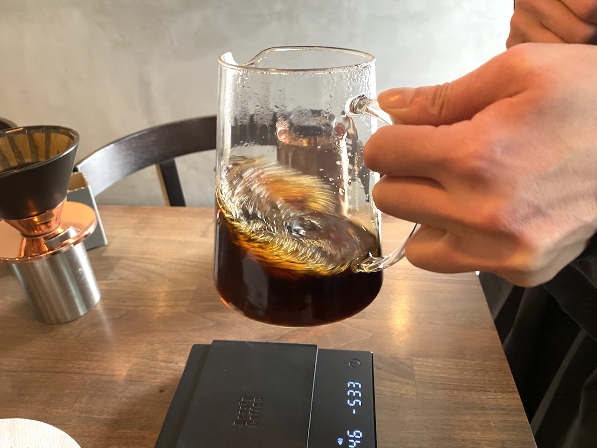 抽出始めと終わりの成分の濃さには差があるので、このまま飲んでしまうと飲むたびに味わいに差が出てしまいます。そのため、サーバーをぐるぐると回して撹拌したら完成です!