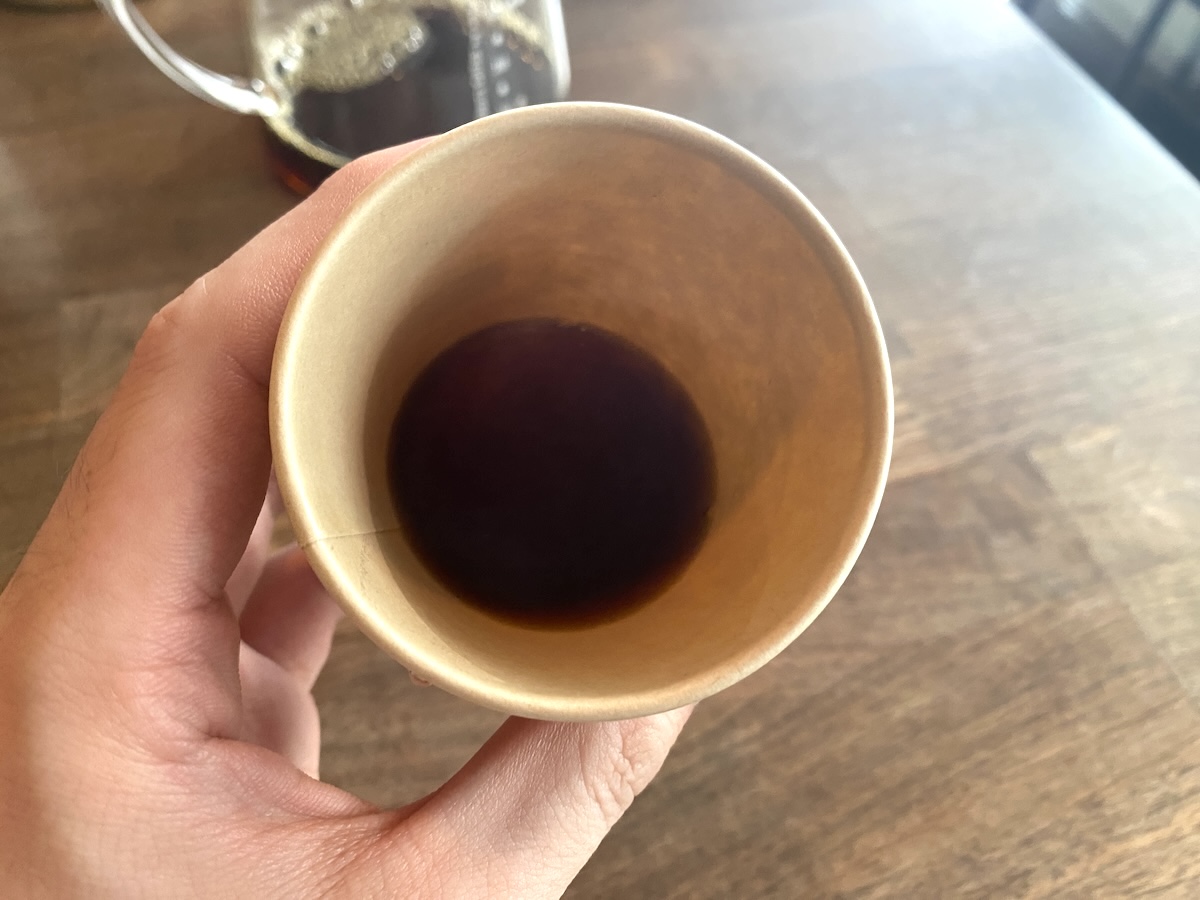 自分で入れたコーヒーを飲んでみると、苦味が非常に強い味わいでした。コーヒーは酸味、甘み、苦味の順に成分が抽出されていくそうで、講師の方によると今回は抽出に時間をかけすぎてしまった結果、苦味の強いコーヒーに仕上がってしまったようです。
