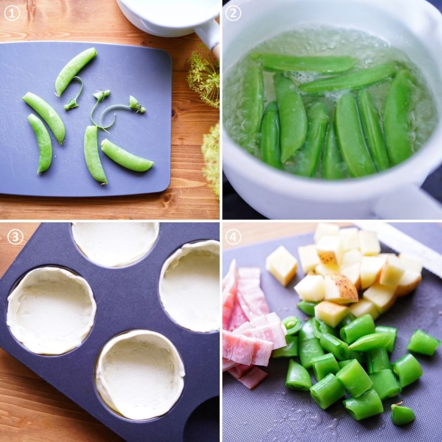 | ✓スナップエンドウ…20本 ✓スライスベーコン…80~100g ✓じゃがいも…小1個 ✓パイシート(10cm角)…6枚 ✓有塩バター…10g ✓塩胡椒…少々 ✓生クリーム…100g ✓牛乳…100g ✓卵…1個 ✓シュレッドチーズ…30g ✓あればパセリやセルフィーユなど…少々 |