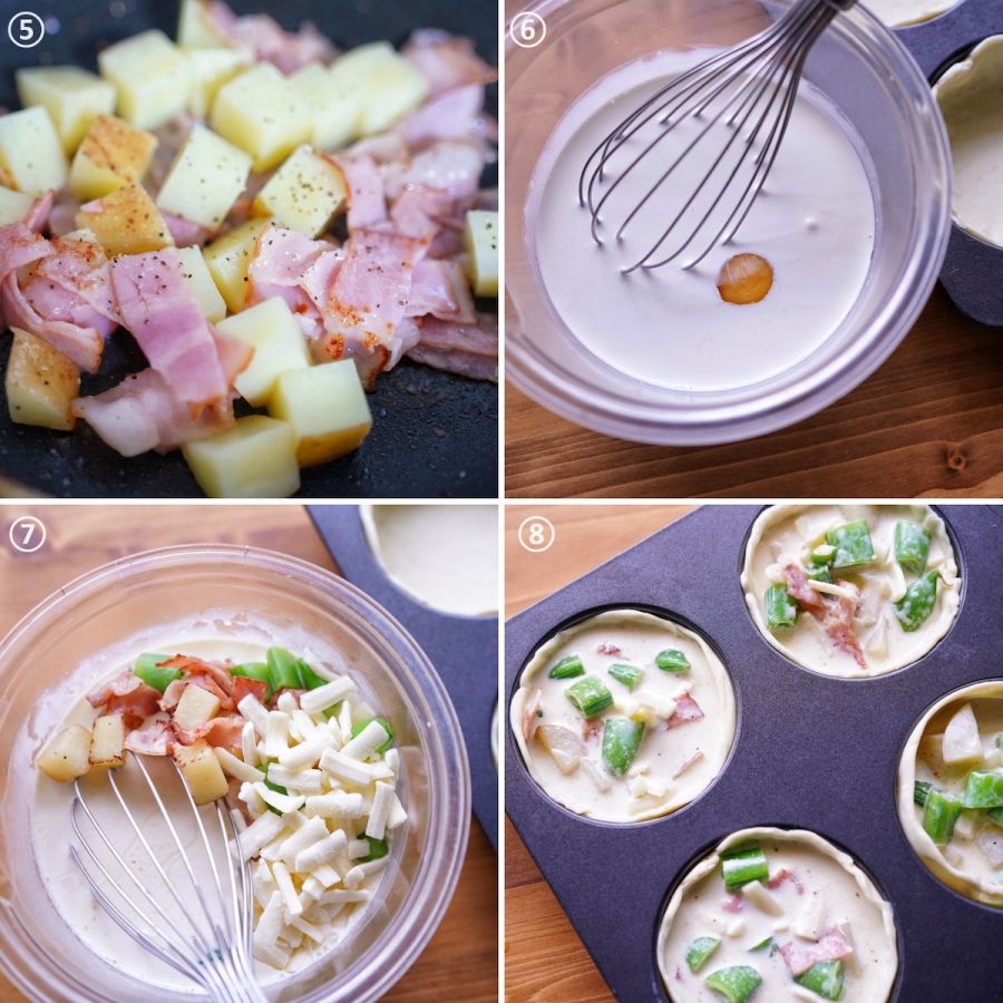 ⑦炒めたベーコンとじゃがいも、スナップエンドウ、シュレッドチーズ、塩胡椒を⑥のボウルに入れ、まんべんなく混ぜます。
