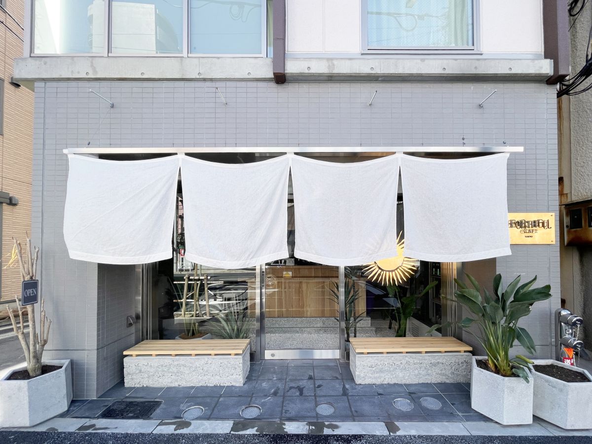 都営大江戸線蔵前駅から徒歩約5分の場所に位置する「Earthful Cafe Tokyo」。店先の観葉植物と大きな白いのれんが目印です。