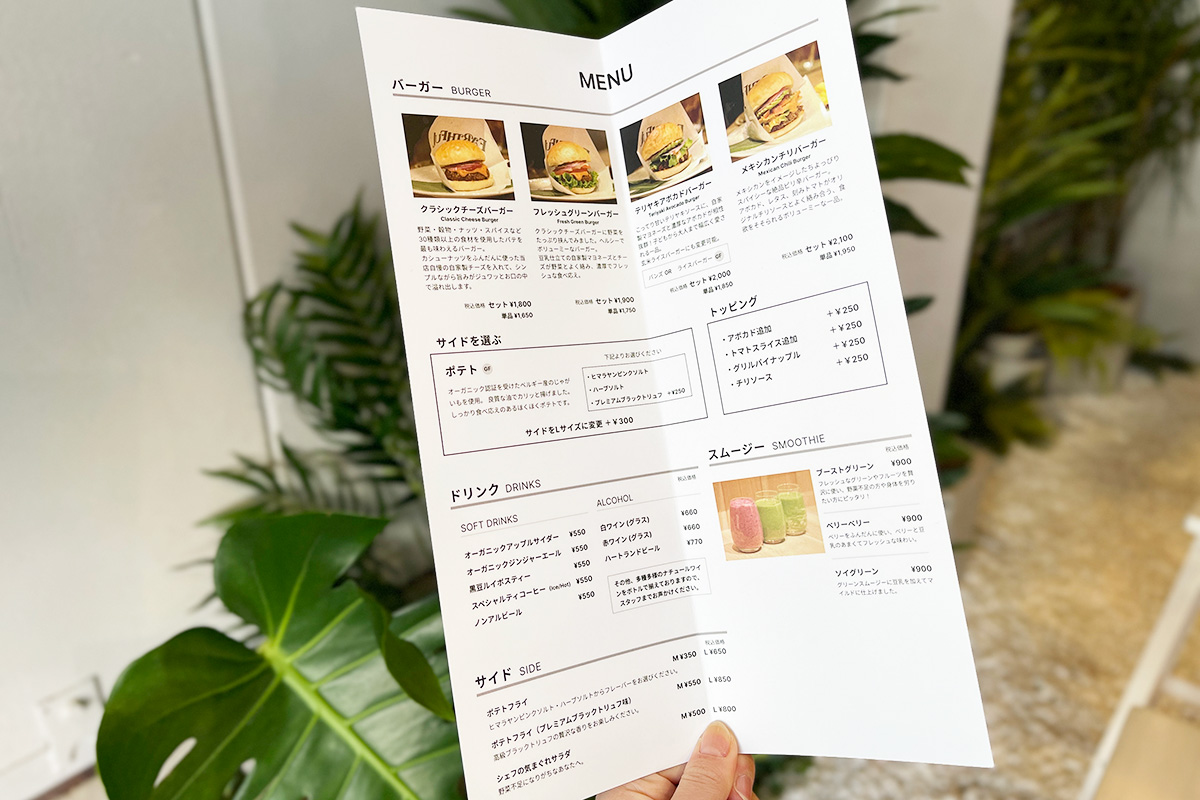 東京店でのグランドメニューは、「クラシックチーズバーガー」、「フレッシュグリーンバーガー」、「テリヤキアボカドバーガー」、「メキシカンチリバーガー」の4種類。「テリヤキアボカドバーガー」のみ、バンズの代わりに「玄米ライス」が選べます。