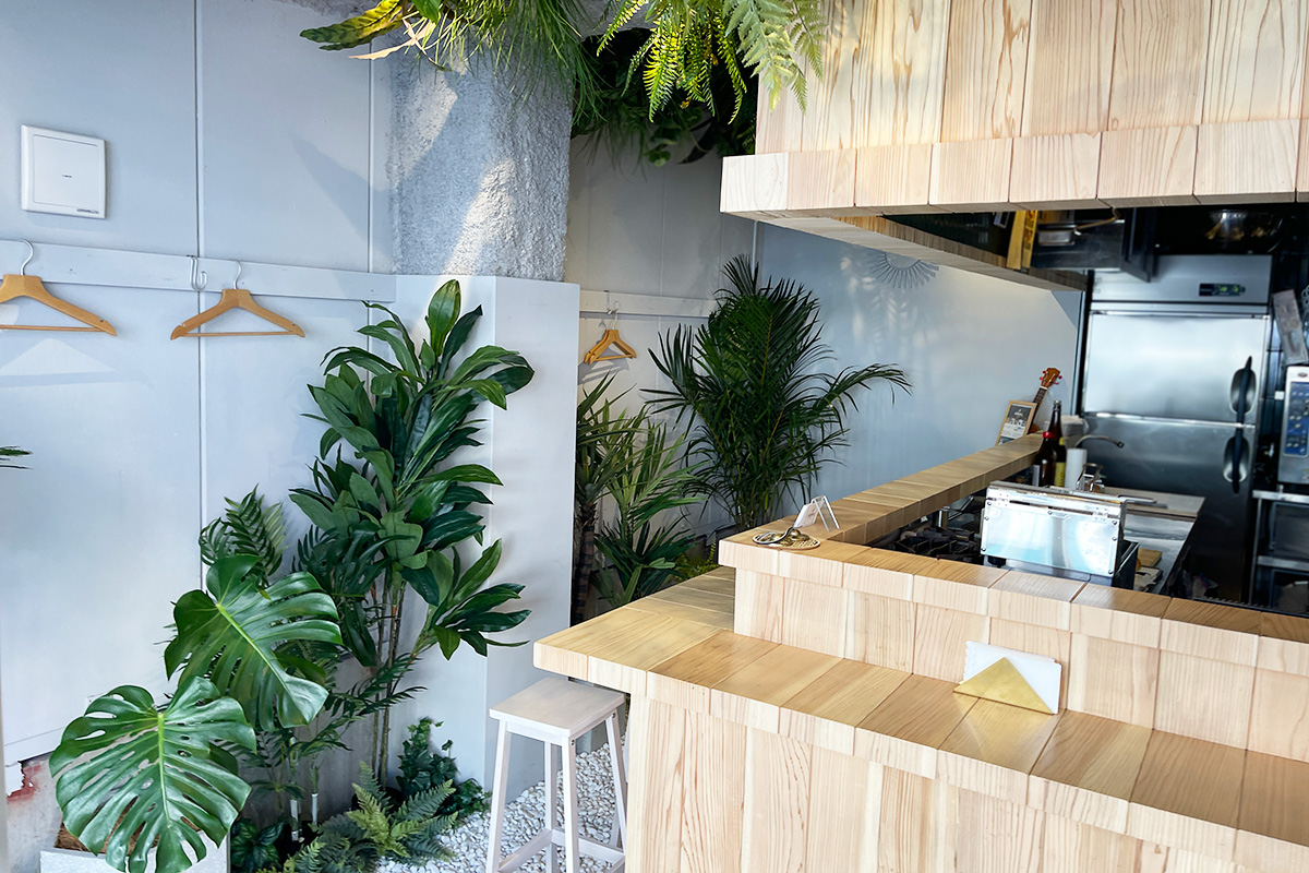 「Earthful Cafe Tokyo」では、心癒やされる店内の雰囲気も魅力。床には玉砂利が敷き詰められていて、足を踏み入れた瞬間からお店の世界観に引き込まれます。沖縄らしいたっぷりのグリーンと神社のモチーフが融合して、都会であることを一瞬忘れさせてくれるようなオアシス的な空間です。