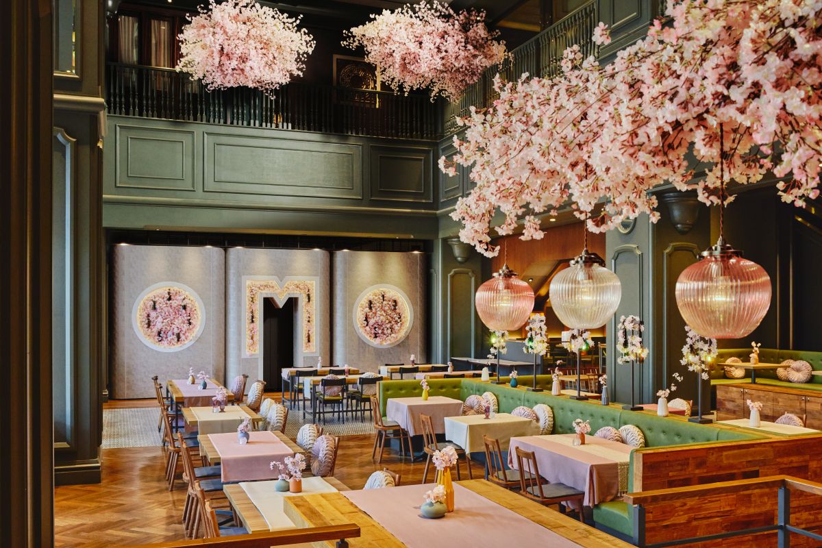 「OMOカフェ&バル」の入り口から天井まで、至るところに桜を装飾。どこに座っても桜に囲まれて気分もUP。